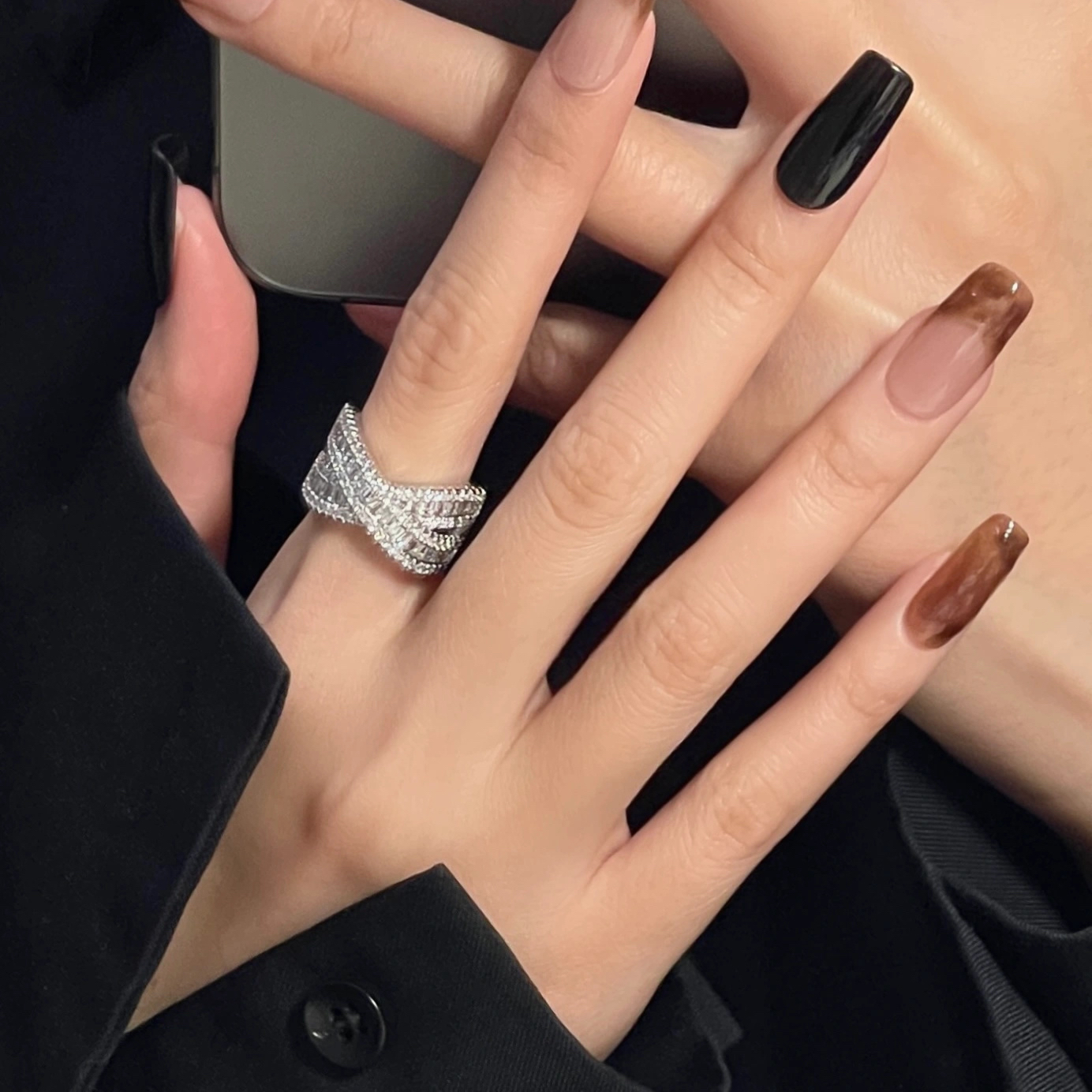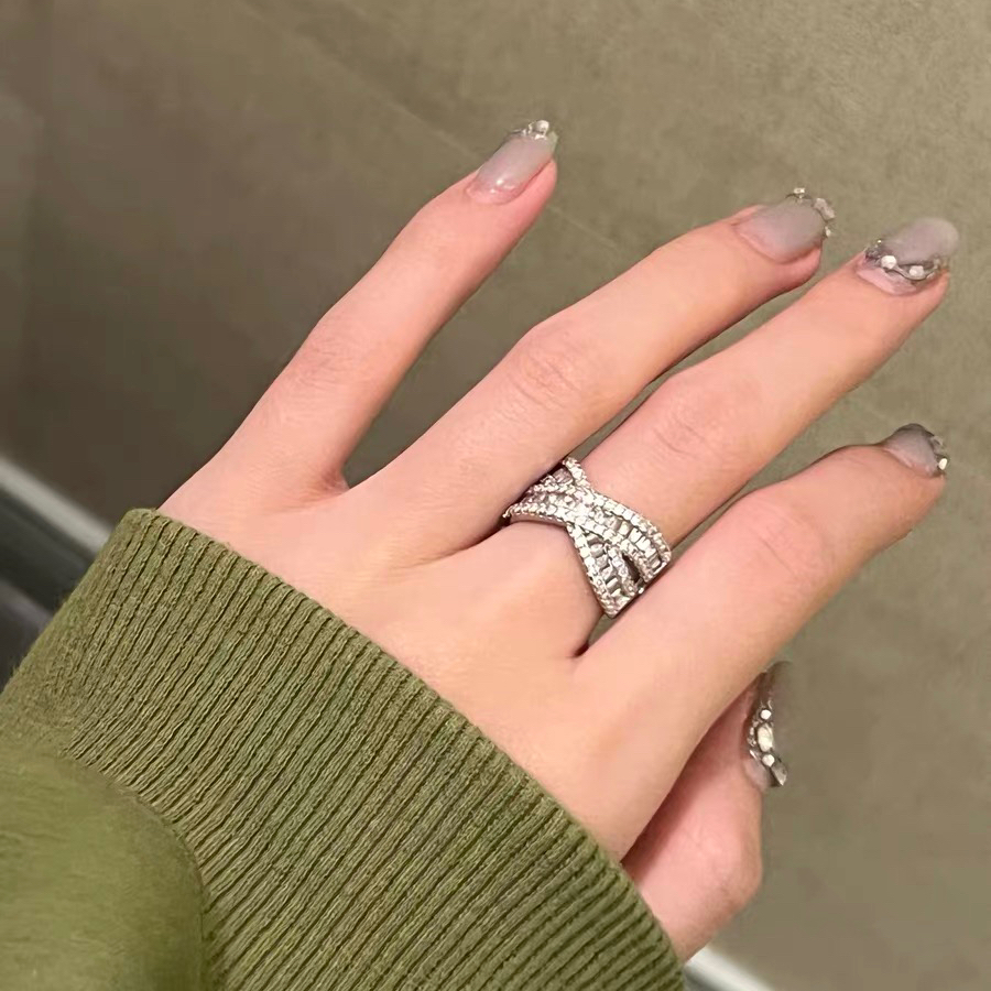 轻奢小众个性重工925镀银交叉排钻锆石戒指高级银色小众精致闺蜜