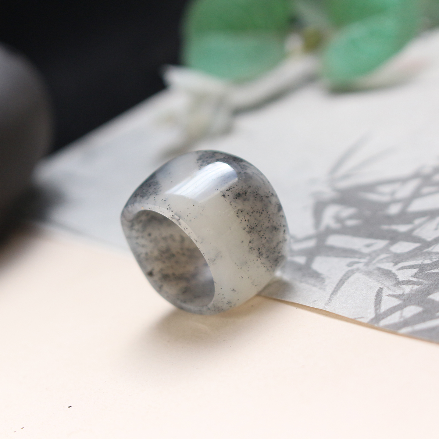 和田玉青花籽料指环宽版方圆黑白一线天意境扳指大戒指孤品可定制