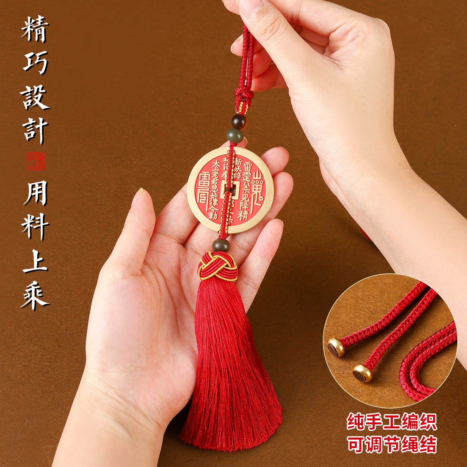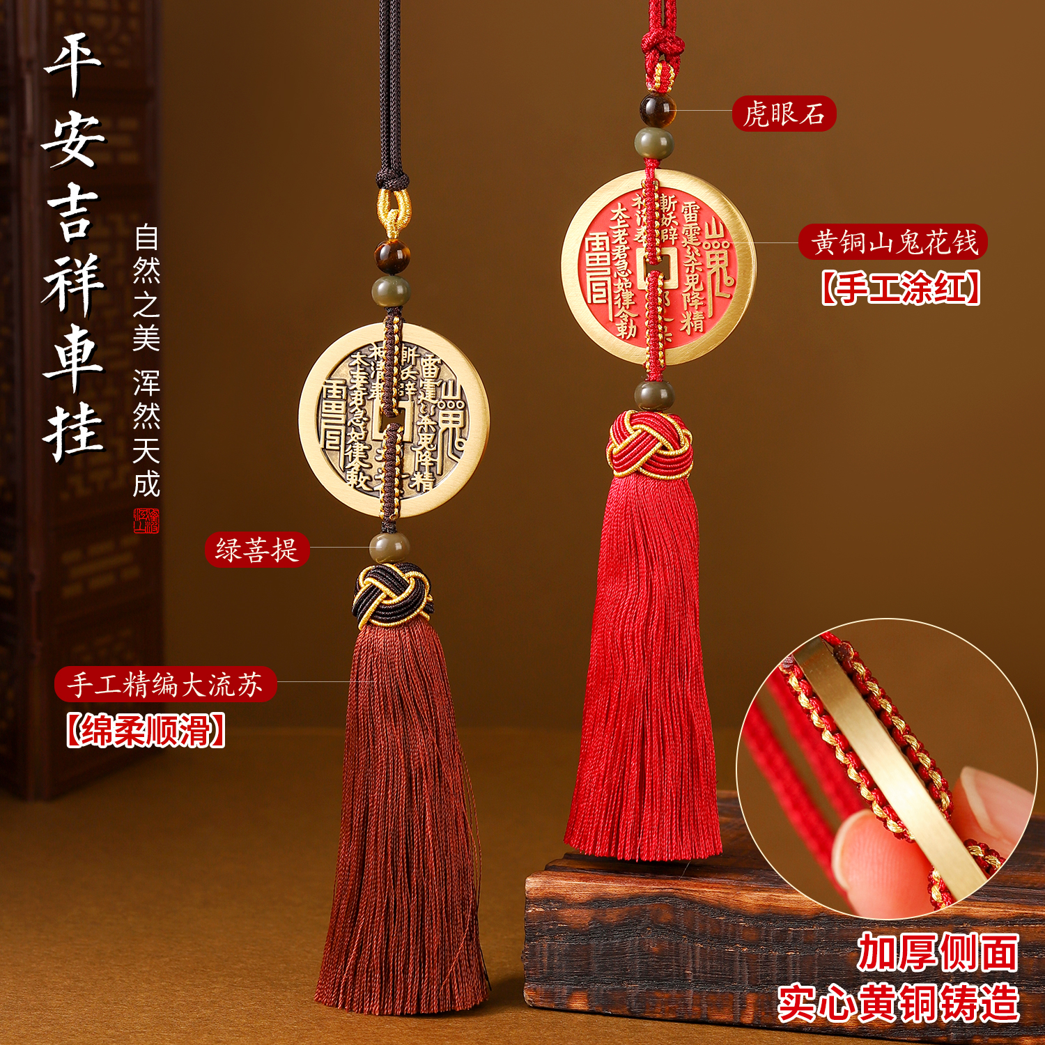 创意新款纯黄铜实心加厚山鬼花钱车挂可调节手工编织绳保平安挂件