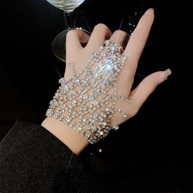 韩式水晶镶钻戒指一体手背链手链新娘结I婚伴娘首饰表演饰品夸张