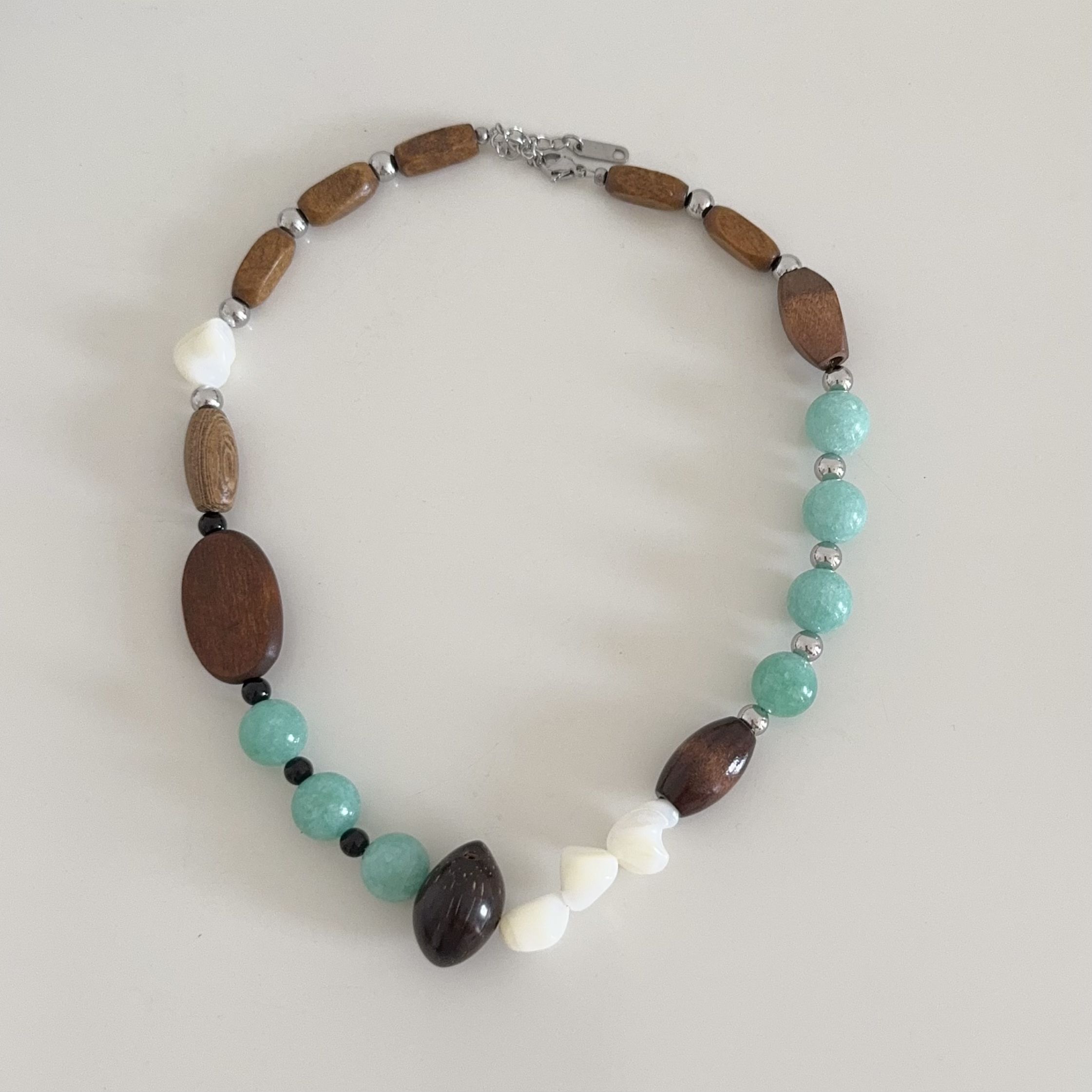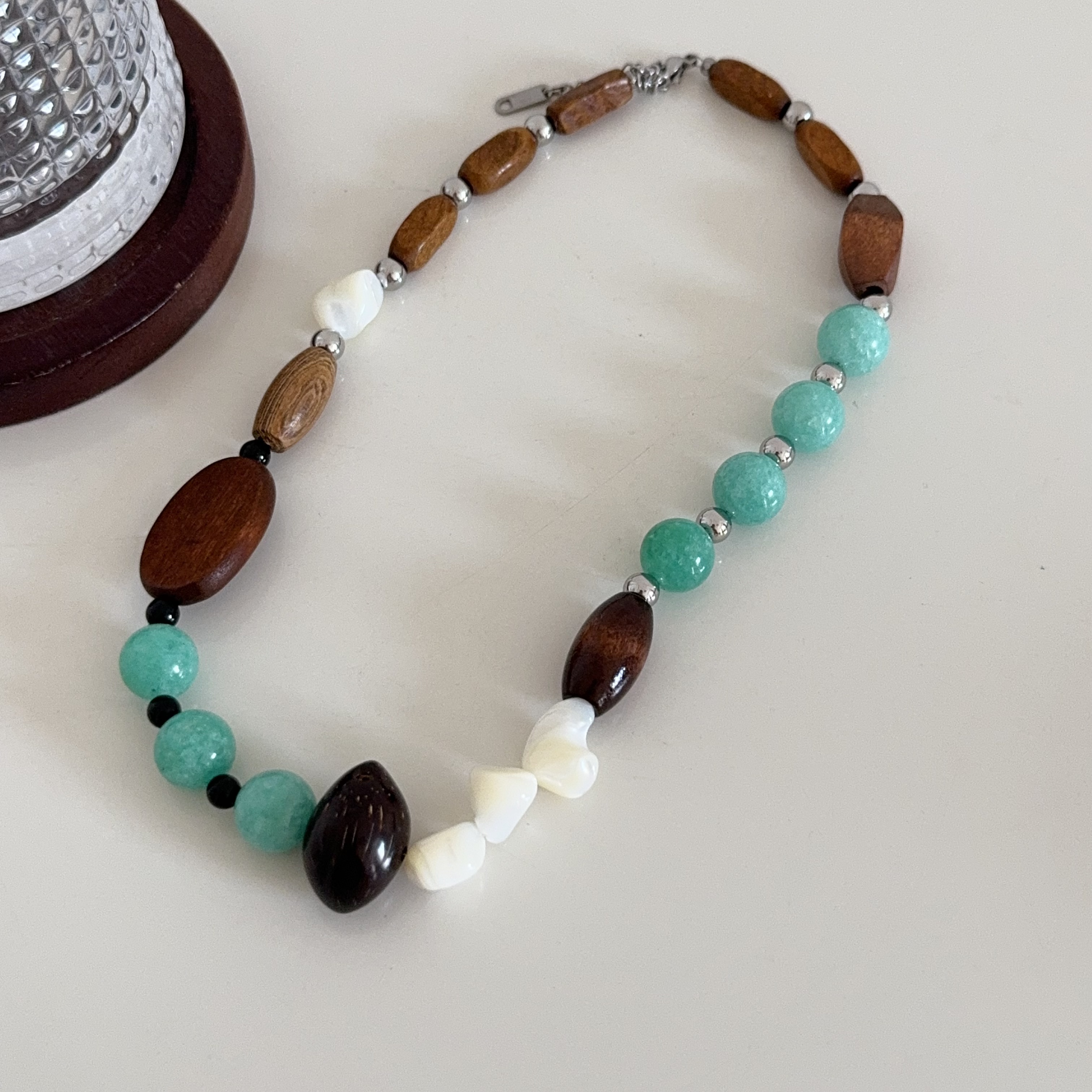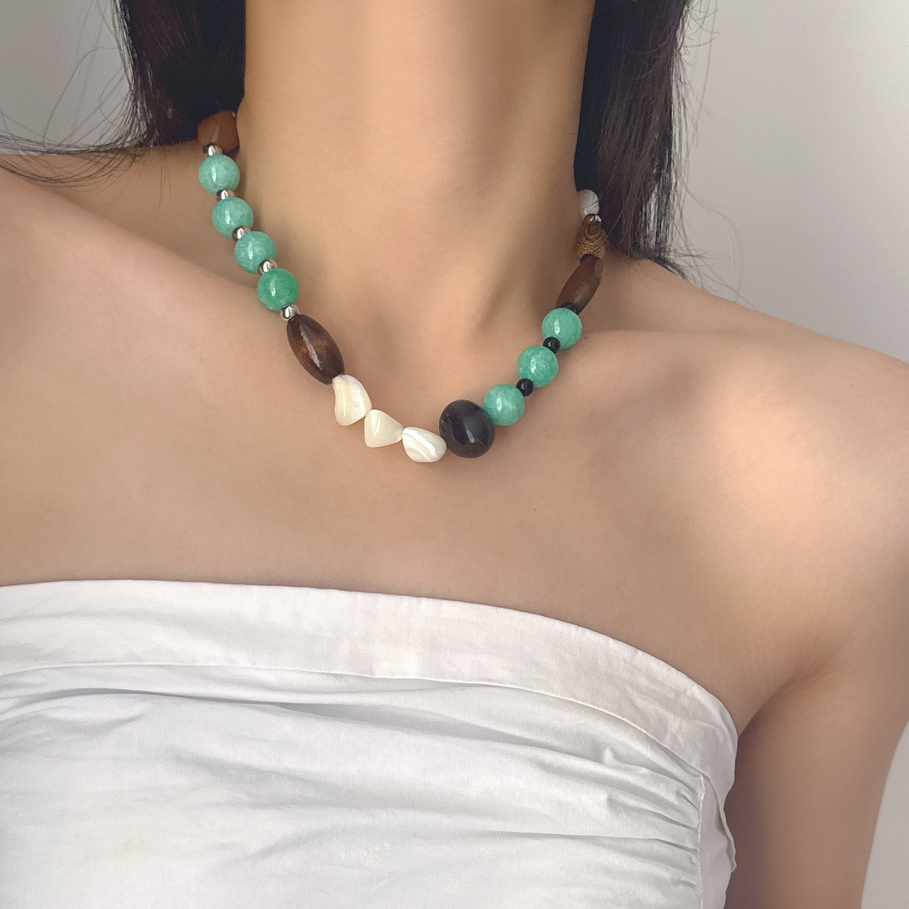 绿色天然石度假风海螺木质椭圆串珠项链女森系不规则锁骨链毛衣链