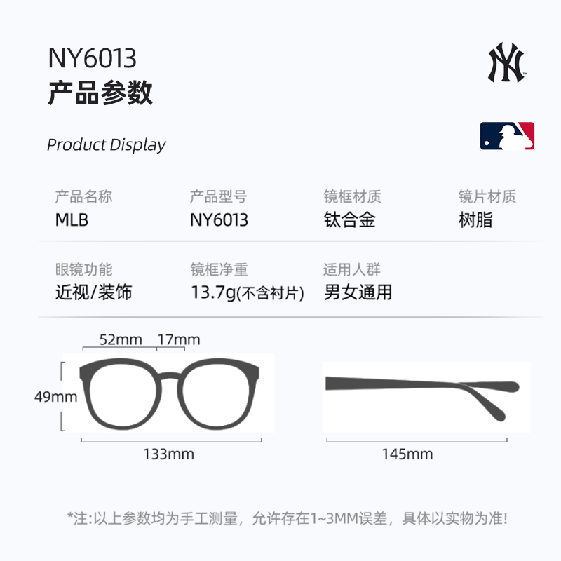MLB2021新款纽约洋基超轻钛架金属黑框眼镜架女大脸显瘦NY6013