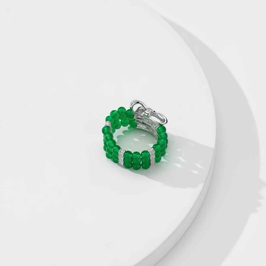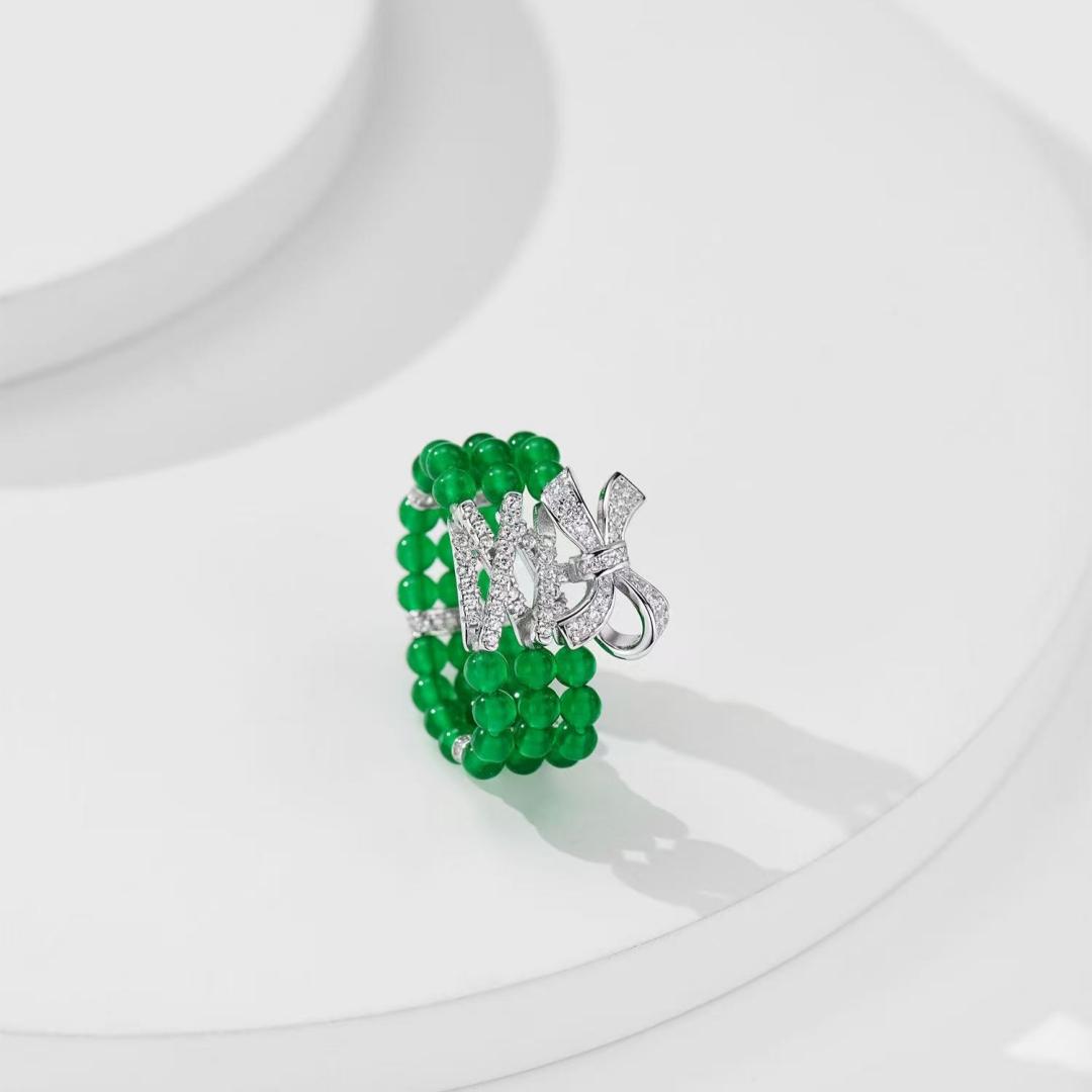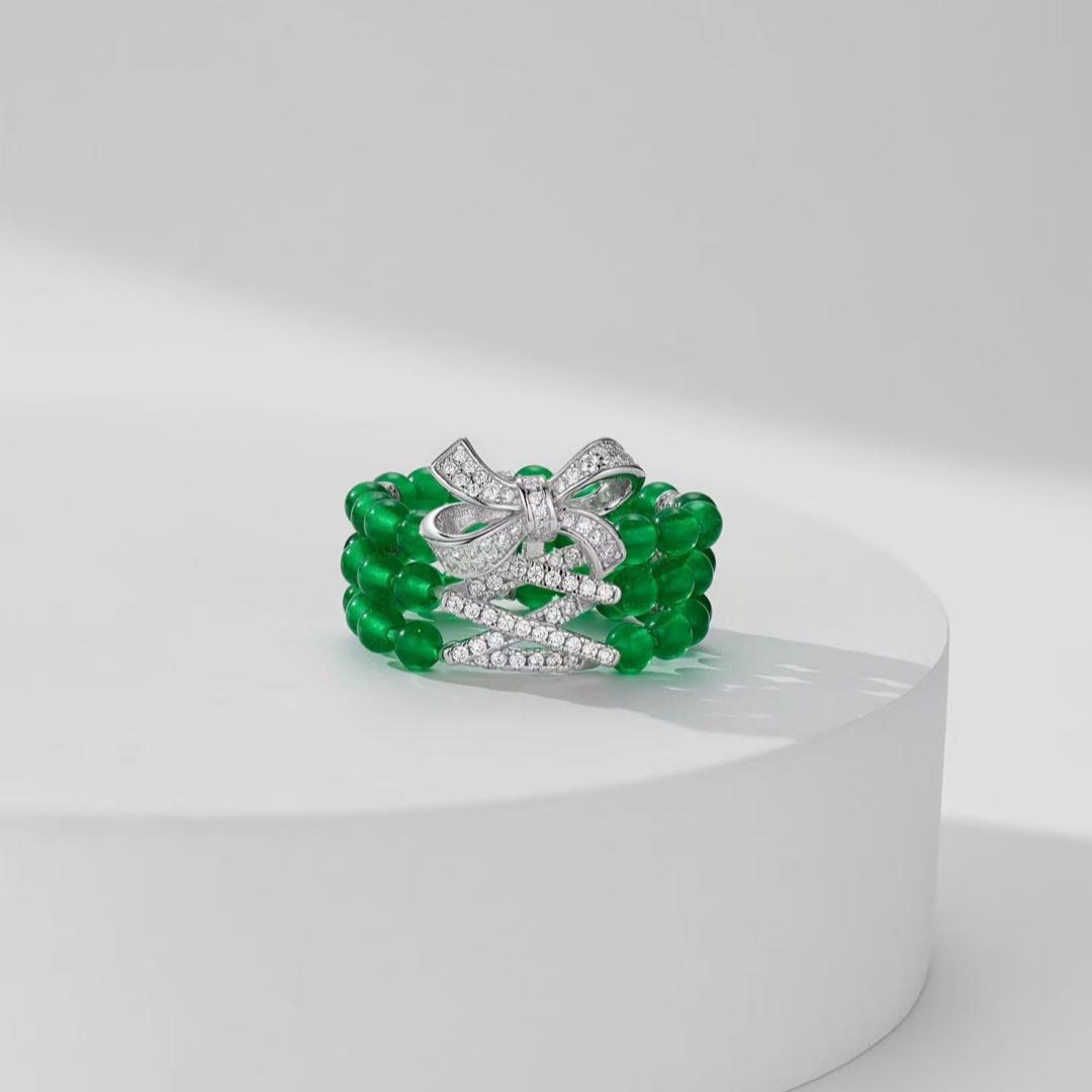 新中式国风绿玉髓珠珠蝴蝶结宽版戒指女925银镀18K白金
