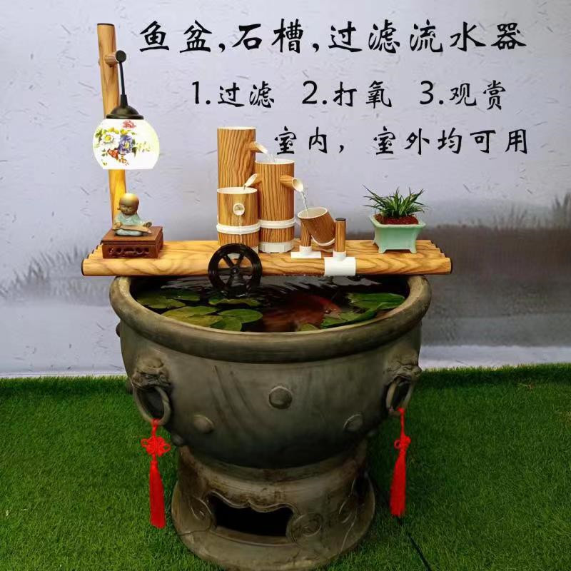 包邮陶瓷鱼缸流水摆件石槽小型鱼盆桌面流水摆件带陶瓷灯
