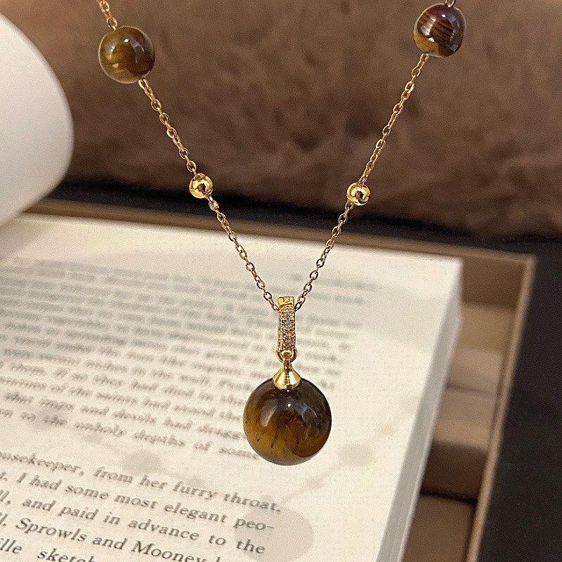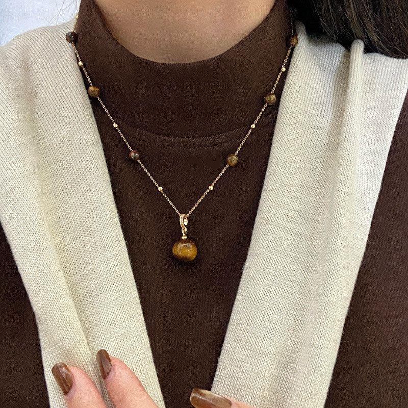 复古金色天然虎眼石吊坠串珠项链女美拉德精致百搭高级锁骨链颈链