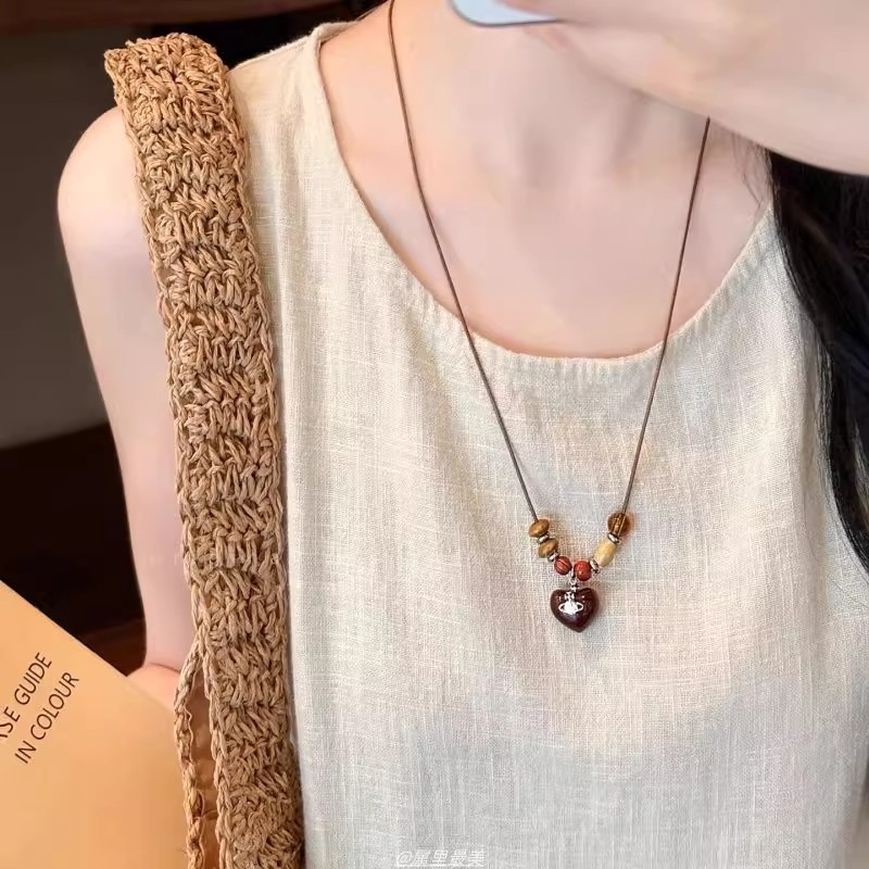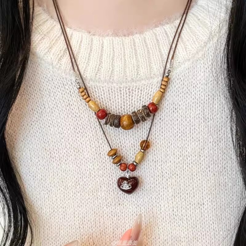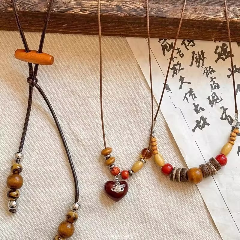 复古木质串珠吊坠项链女小众设计感民族风配饰时尚长款百搭毛衣链