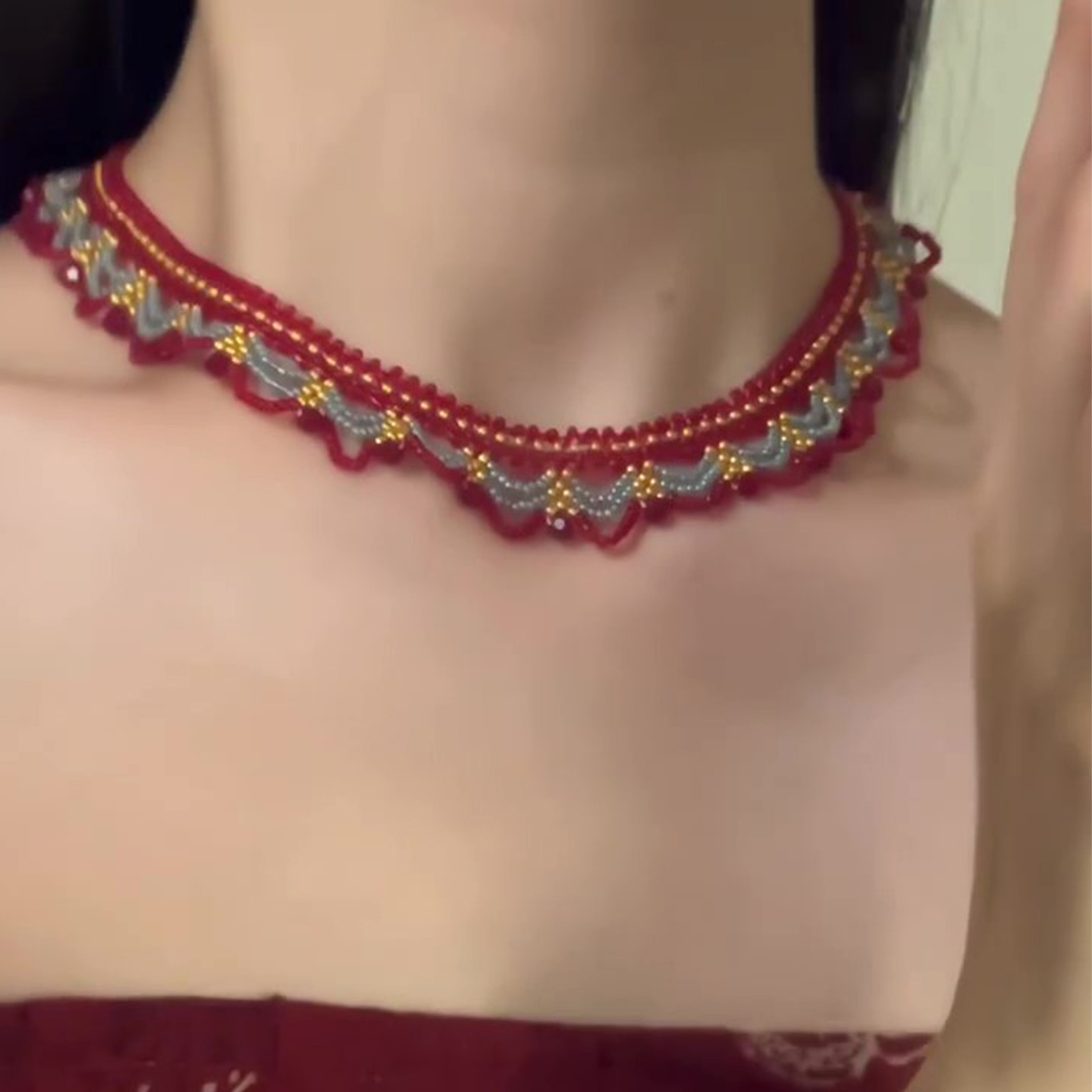 宫廷风复古红色蕾丝串珠项链女百搭颈链轻奢小众高级感锁骨链配饰