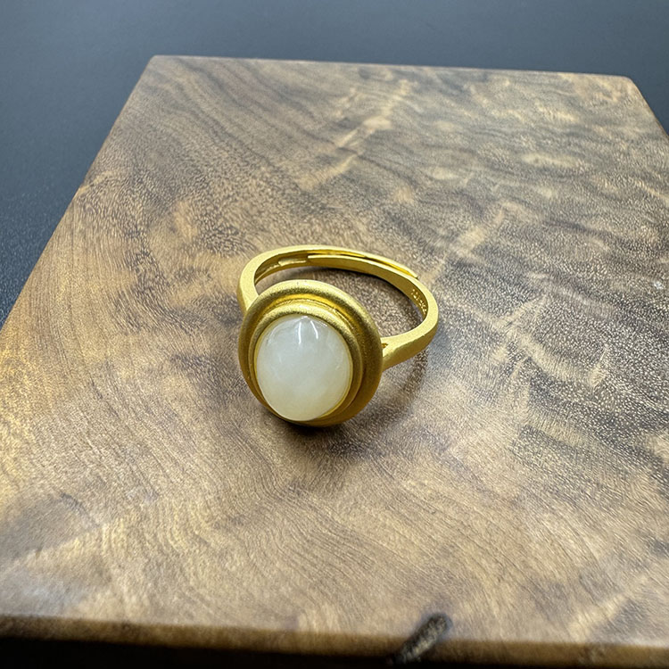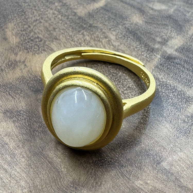 2025新款简约银镀金镶嵌天然和田玉戒指蛋面指环女款时尚个性