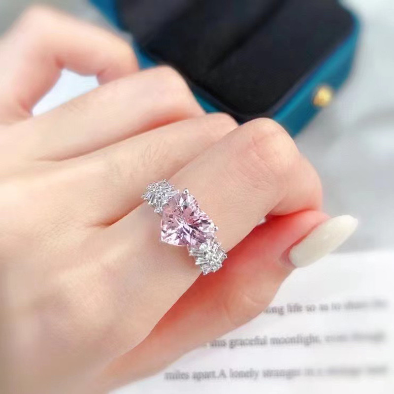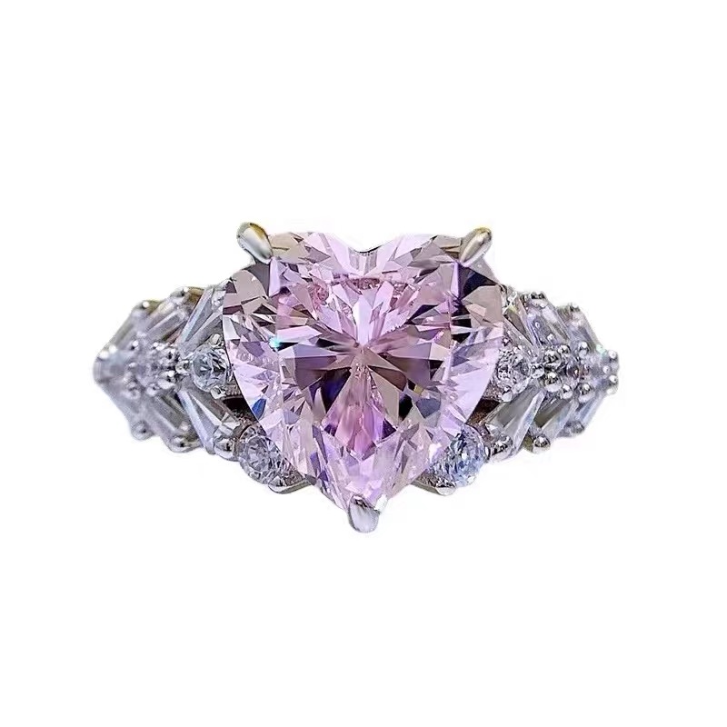 PT950铂金镶嵌莫桑石D色微镶方形排钻爱心粉钻戒指轻奢甜美女纯银