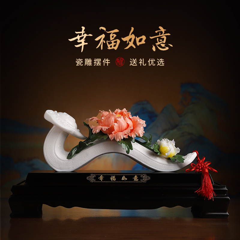 牡丹瓷花如意陶瓷摆件客厅轻奢高档办公室酒柜玄关装饰品送礼礼品