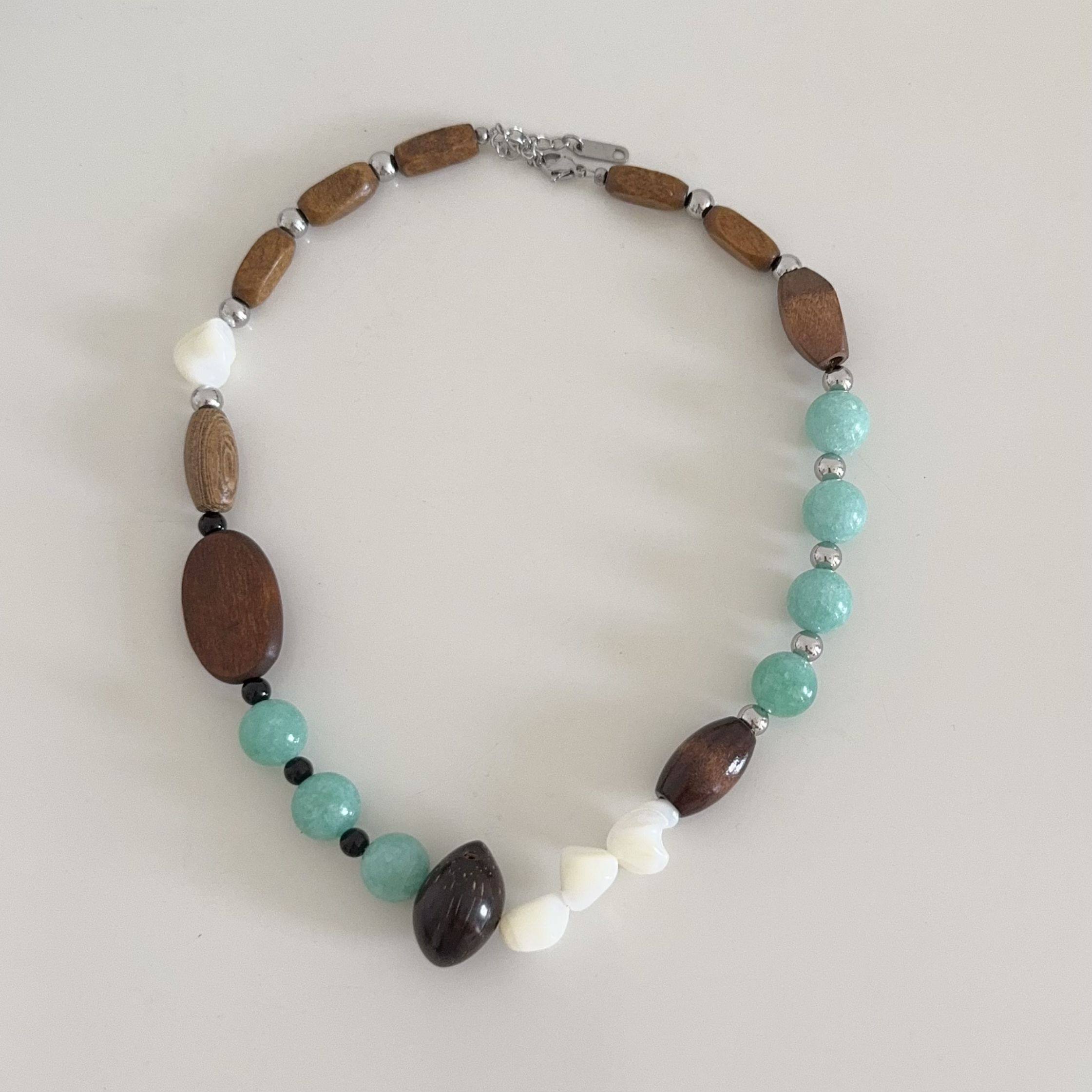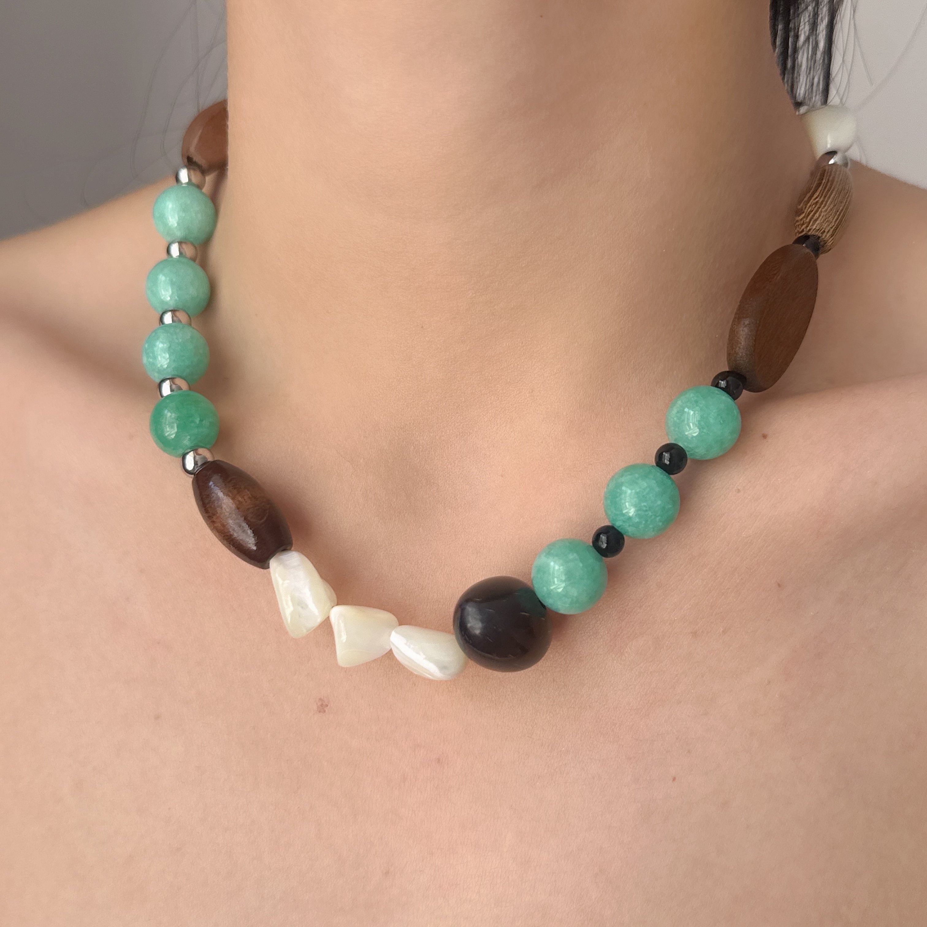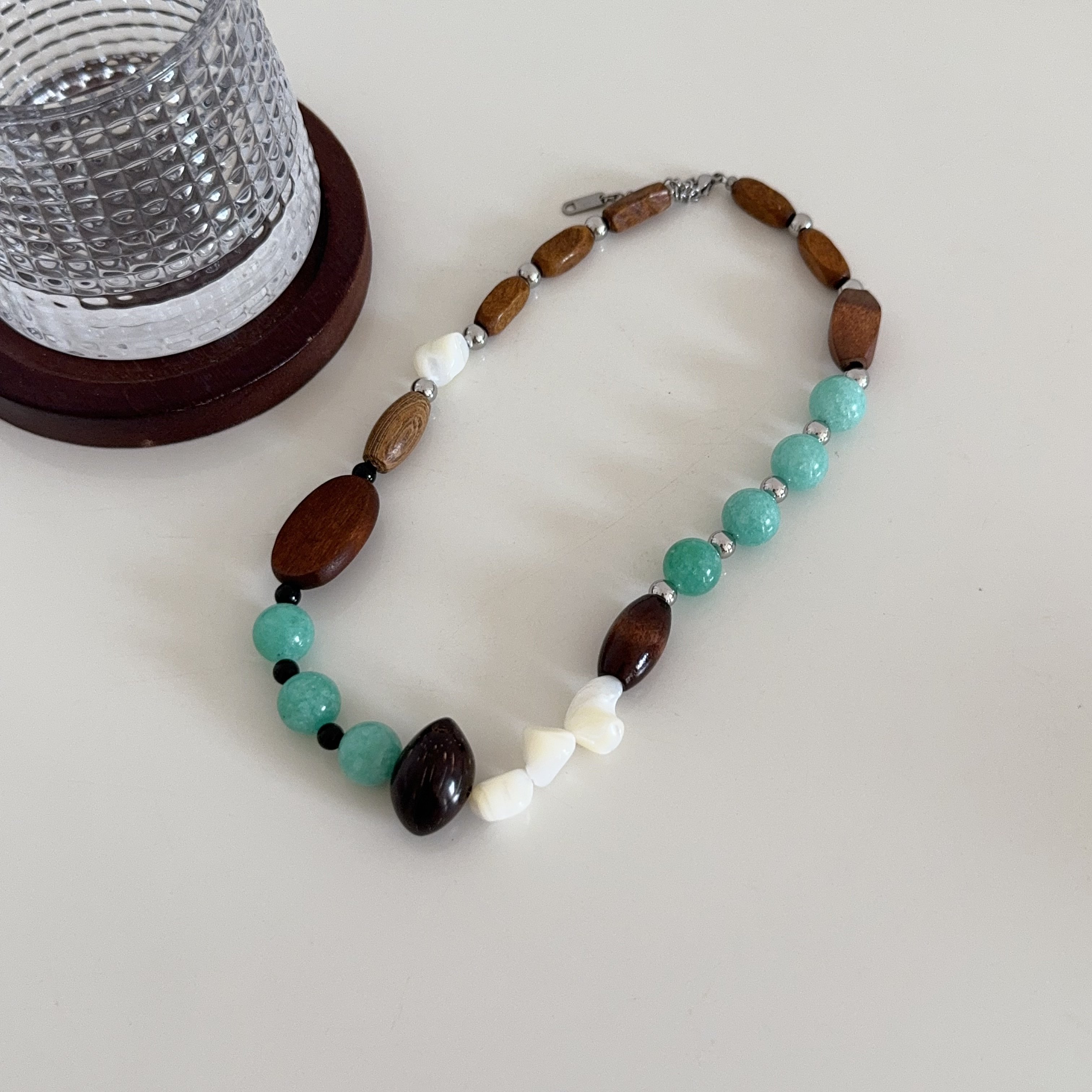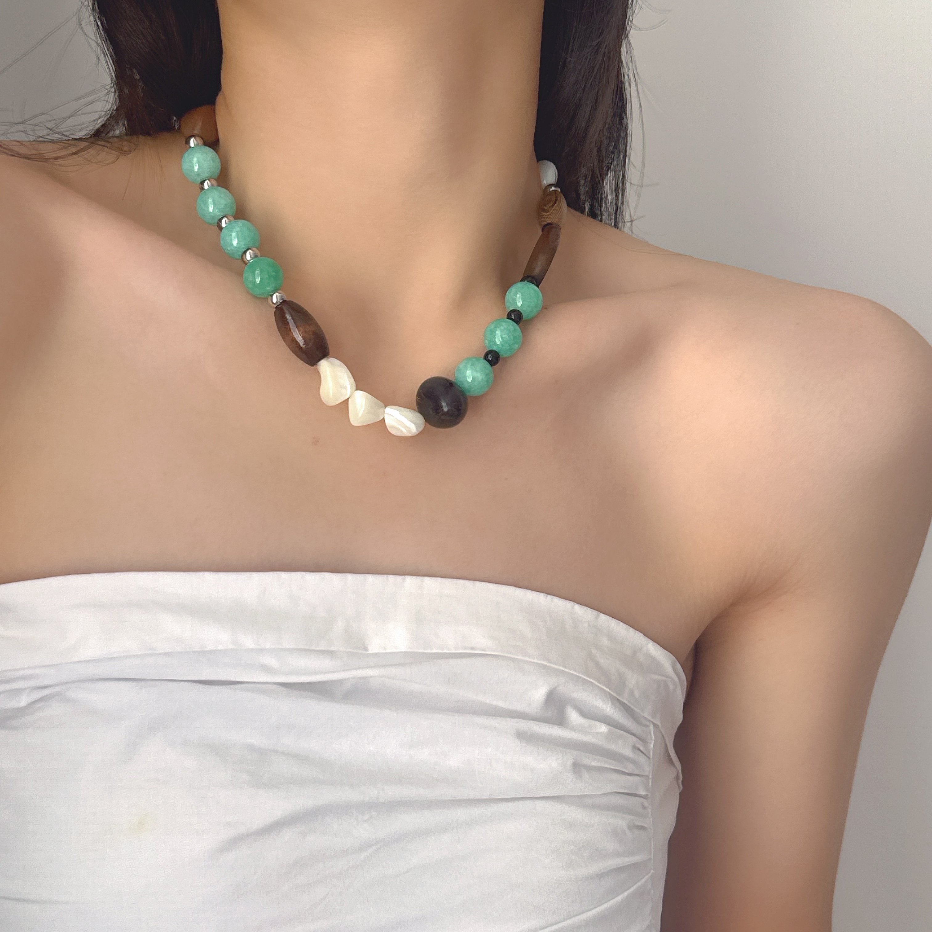 波西米亚绿色天然石度假风海螺木质椭圆串珠项链女异形锁骨链颈链