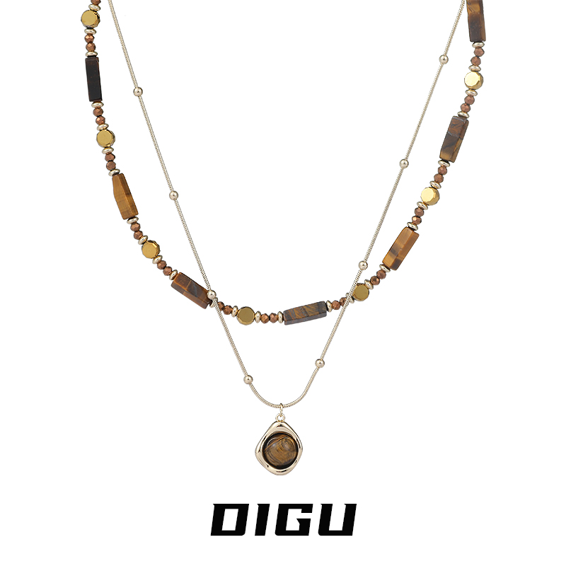 DIGU气质美拉德风天然石串珠项链秋冬双层叠戴毛衣链虎眼石锁骨链
