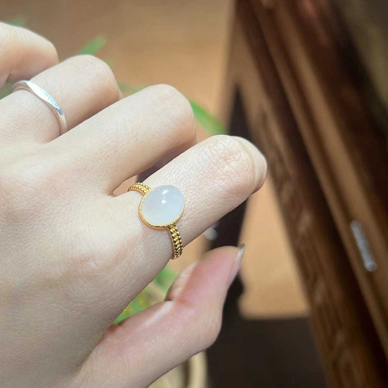 新款和田玉白玉蛋面镶嵌开口戒指女生礼物