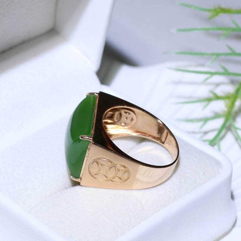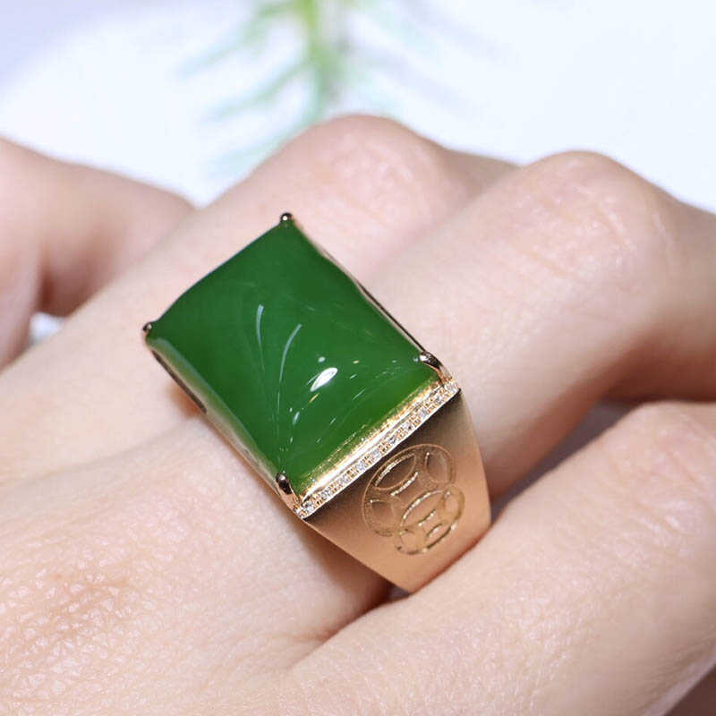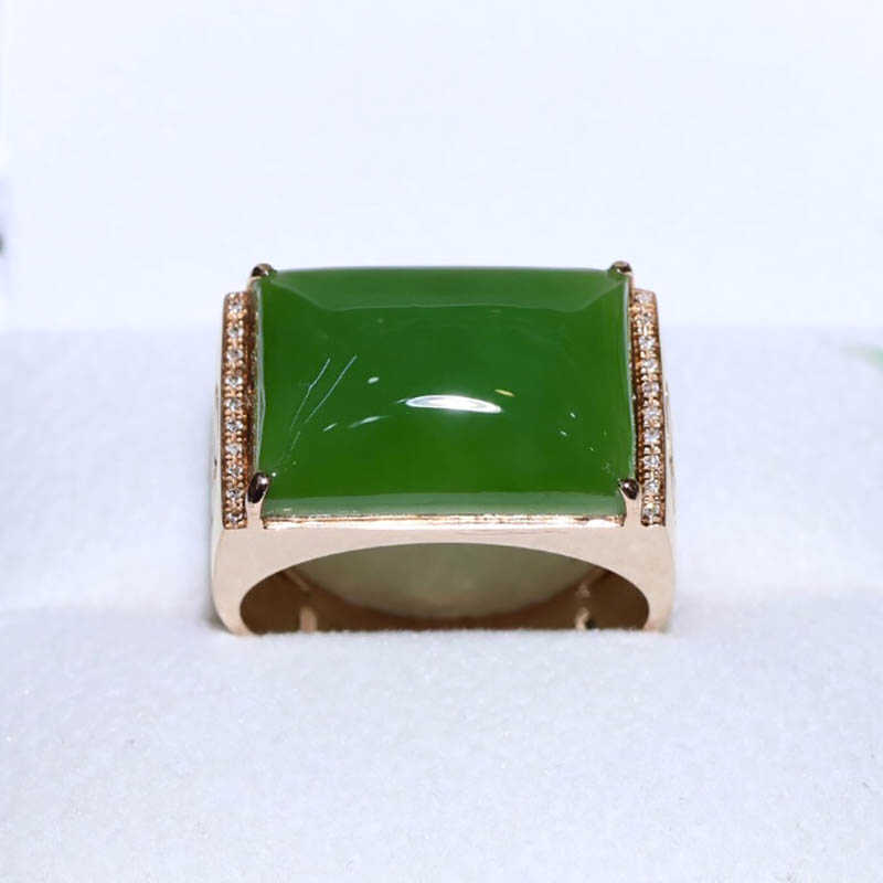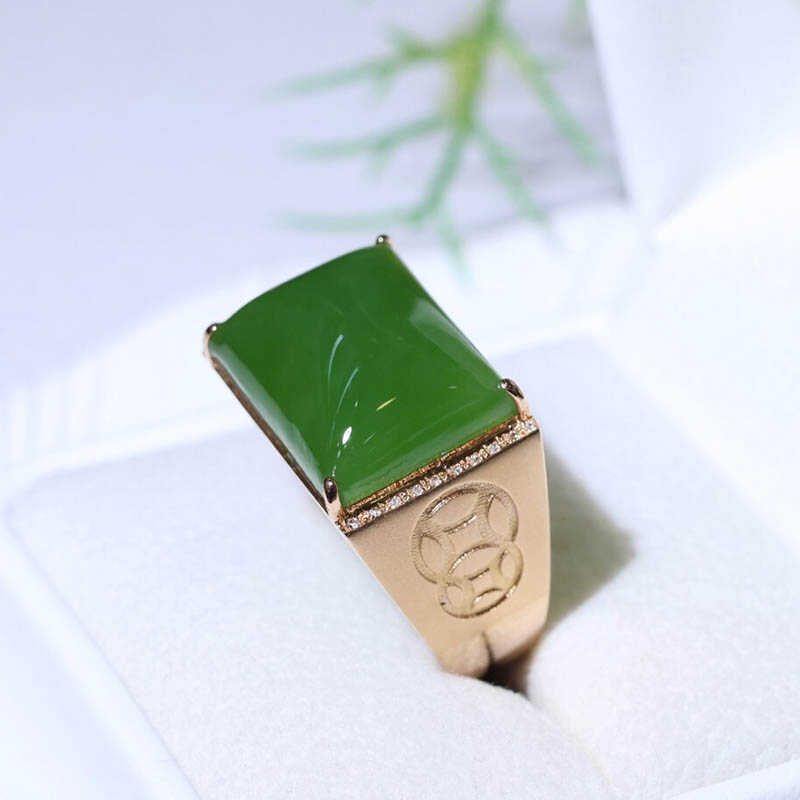 中秋礼品碧玉戒指18K金镶天然a玉石指环男士扳指戒圈时尚珠宝首饰