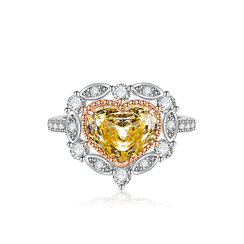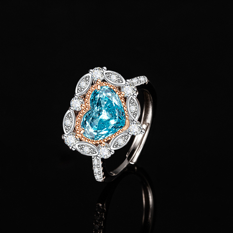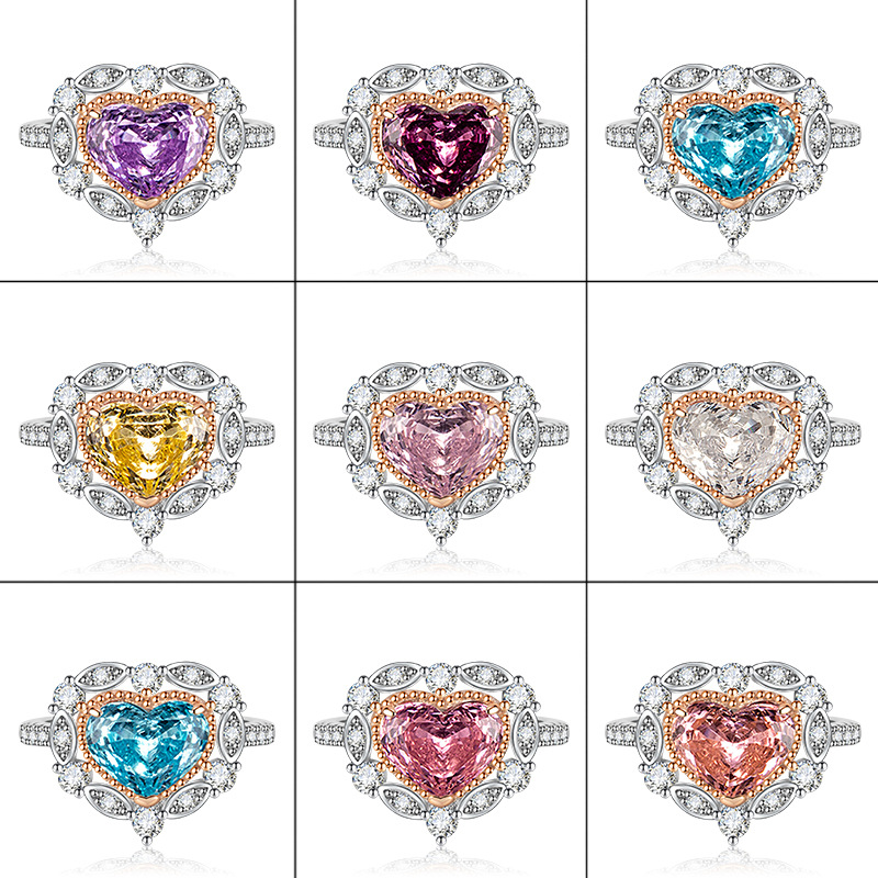 新款桃心玫瑰切紫色高碳钻戒指女时尚粉色海蓝爱心形指环高端设计