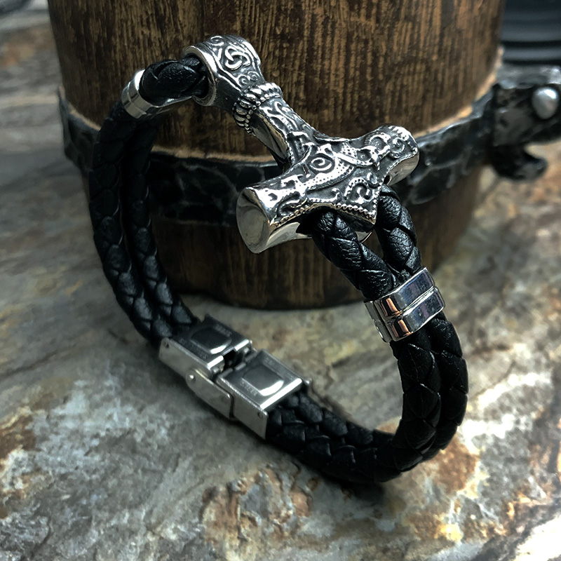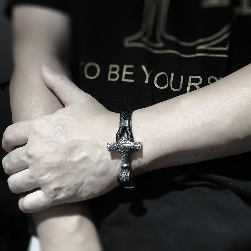 北欧维京饰品雷神之锤黑皮编织手链男生潮流个性手饰小众设计配饰