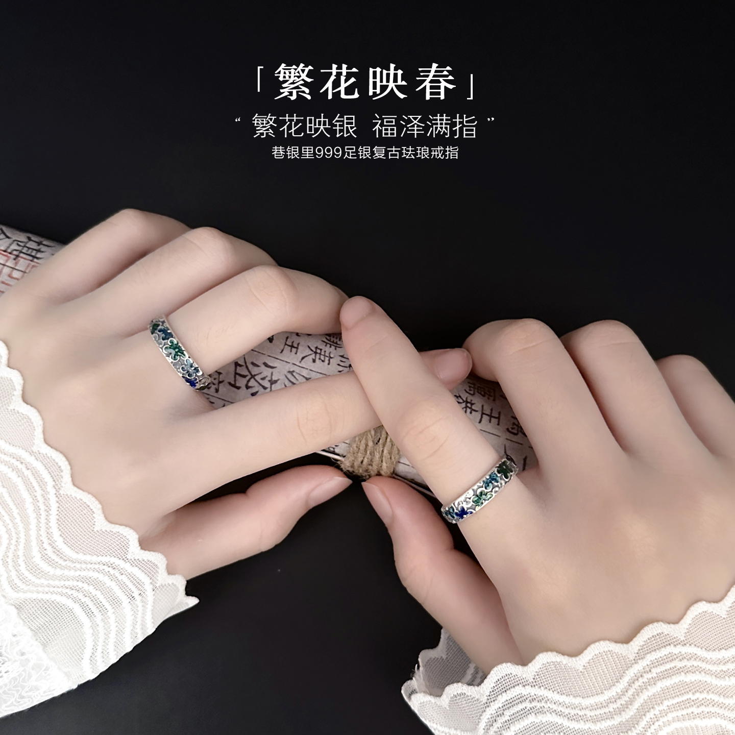 巷银里[繁花映春]999足银戒指珐琅彩指环女纯银复古新中式食指戒