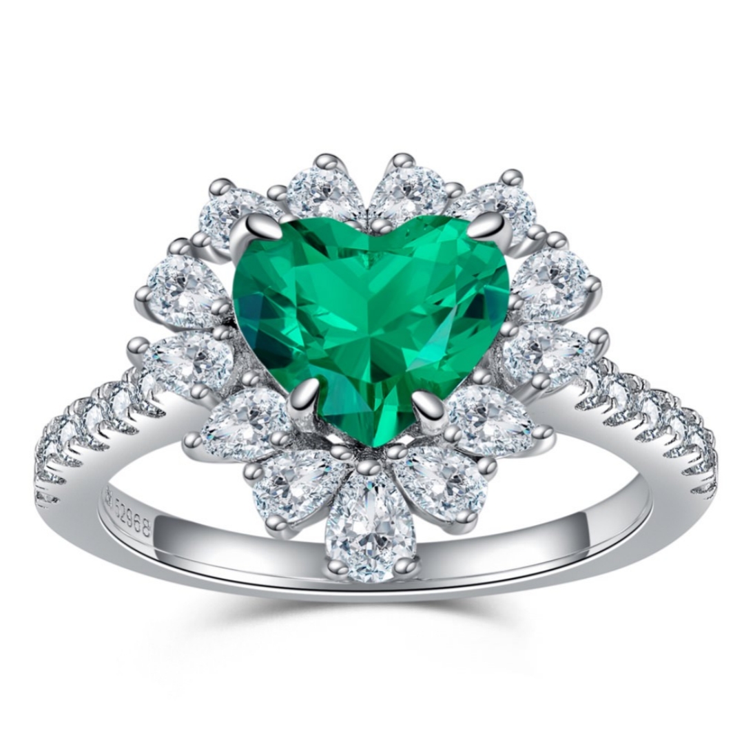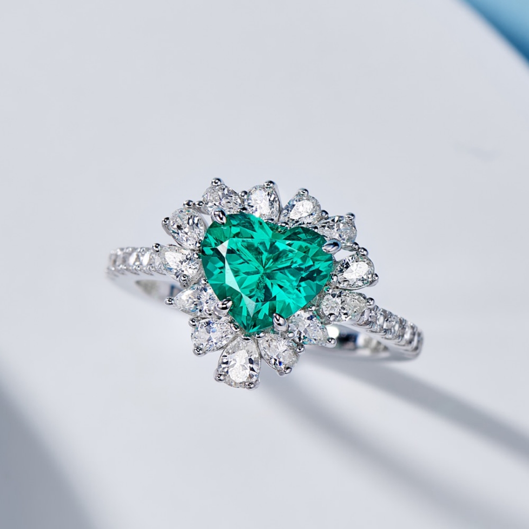 哥伦比亚色实验室培育祖母绿1.5克拉爱心形钻石戒指女925纯银轻奢