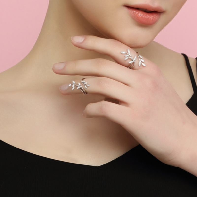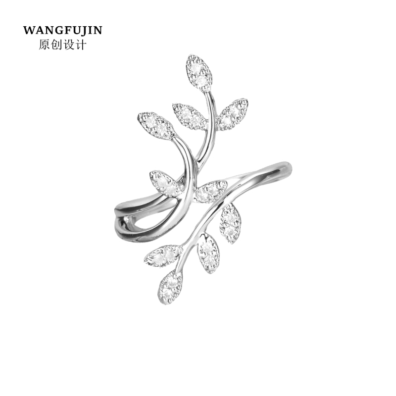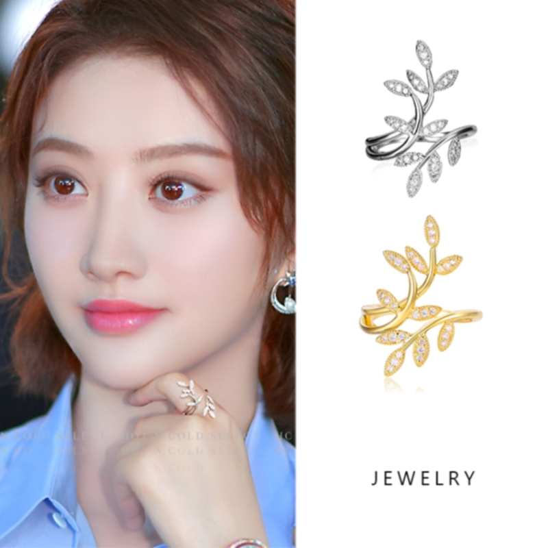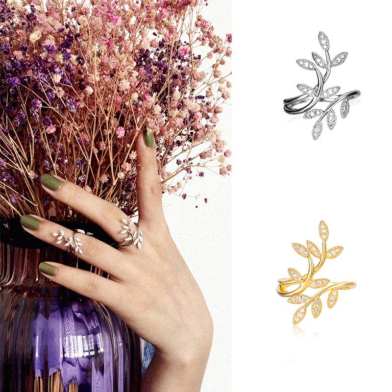 加拿大设计师橄榄枝戒指纯银镀黄金色 女叶子指环镶钻ins个性礼物