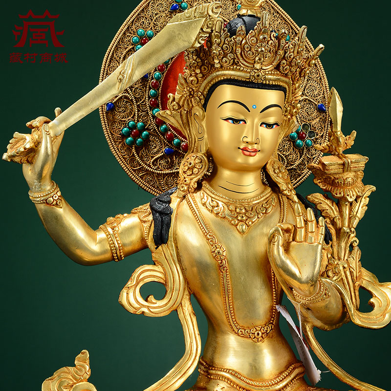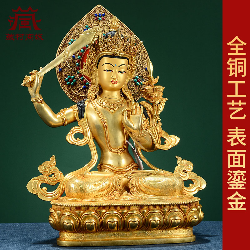 尼泊尔手工《文殊菩萨》宝石镶嵌家用《文殊普贤》桌面铜像摆件