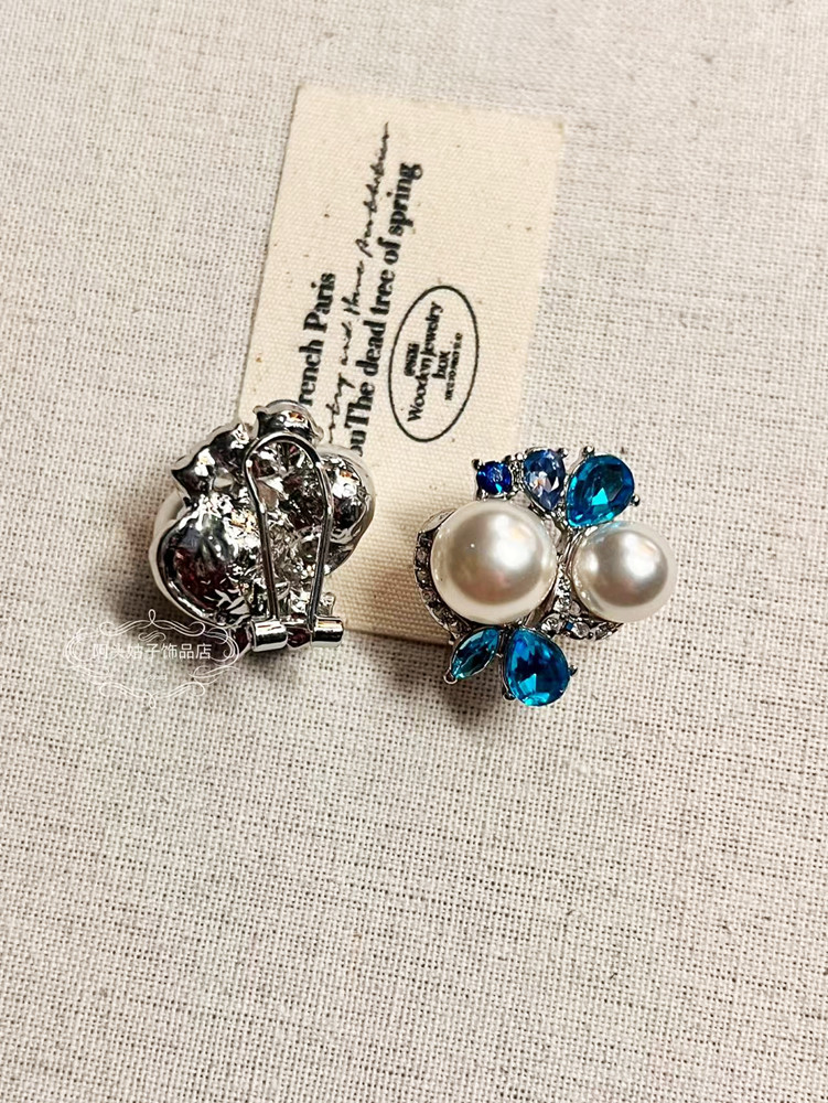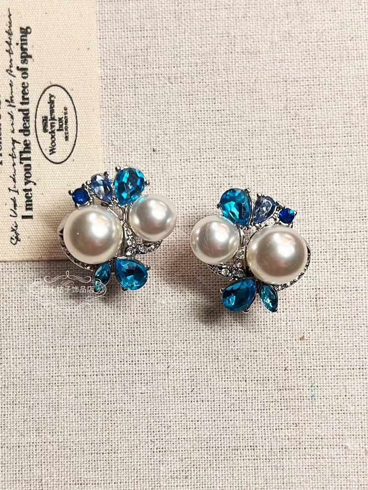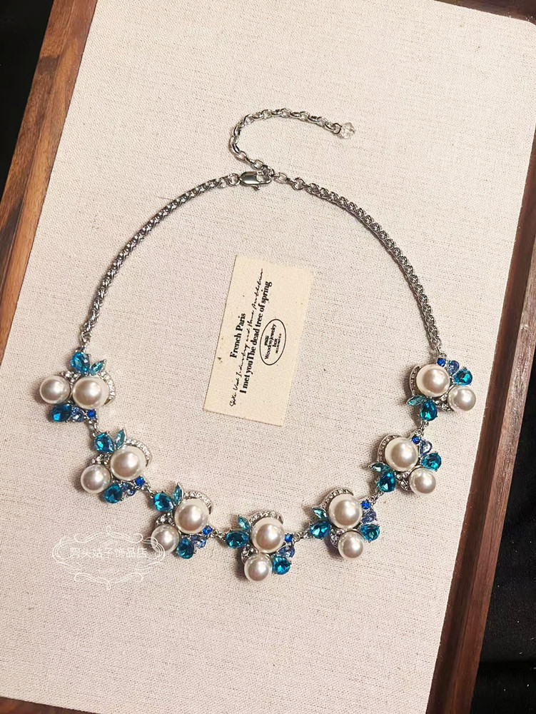 欧美宫廷风中古vintage复古气质蓝色闪钻珍珠短款项链耳环套装女