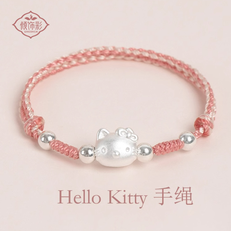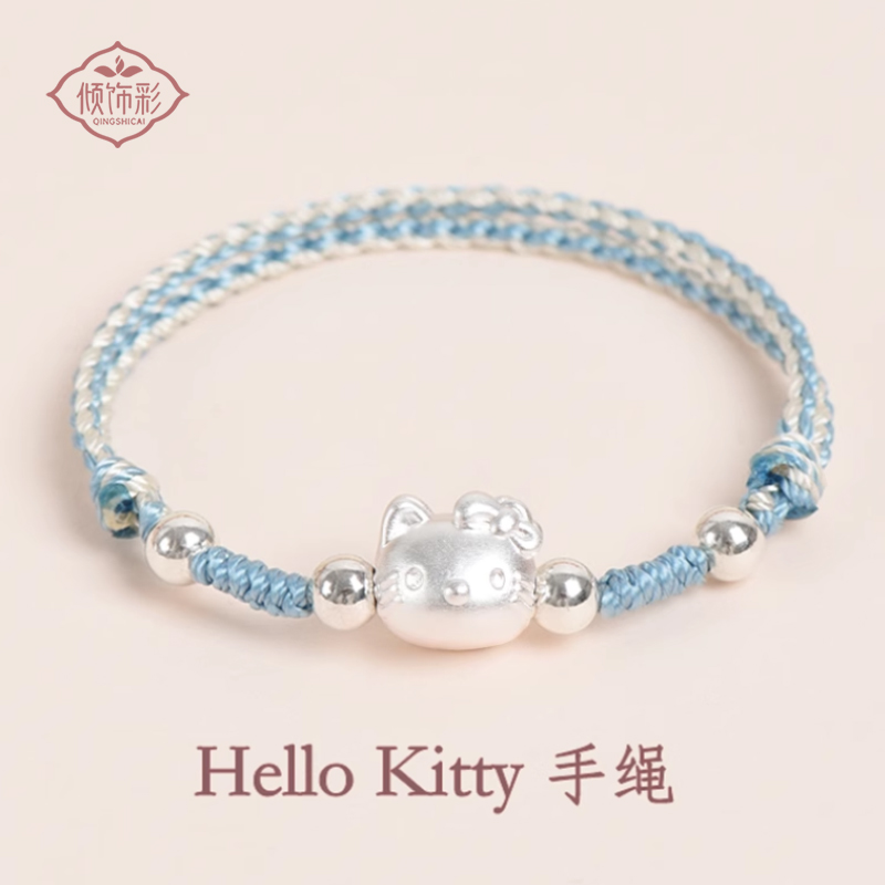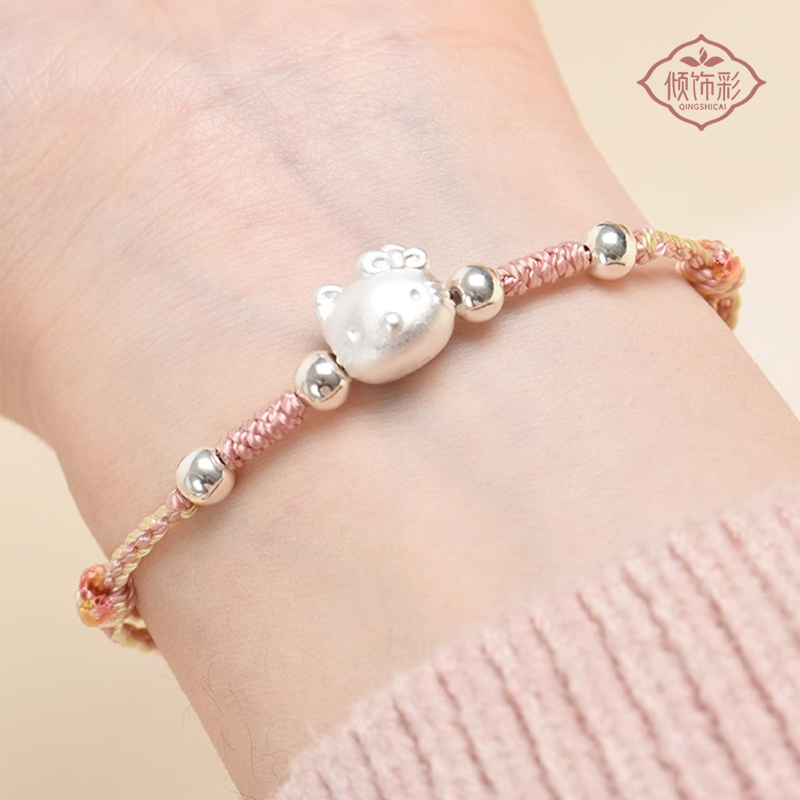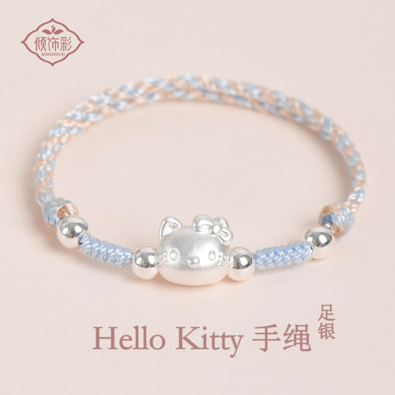 足银999kitty凯蒂猫手链绳女款手工编织儿童送圣诞生日礼物手绳