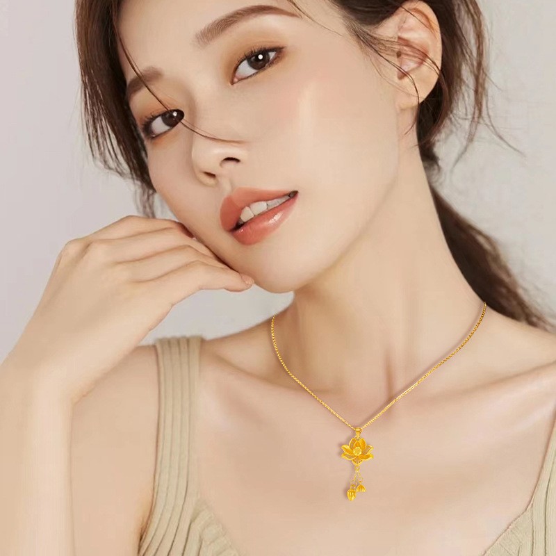 黄金包银饰品莲花吊坠黄金色项链女两世欢荷花莲蓬苞挂坠锁骨链子
