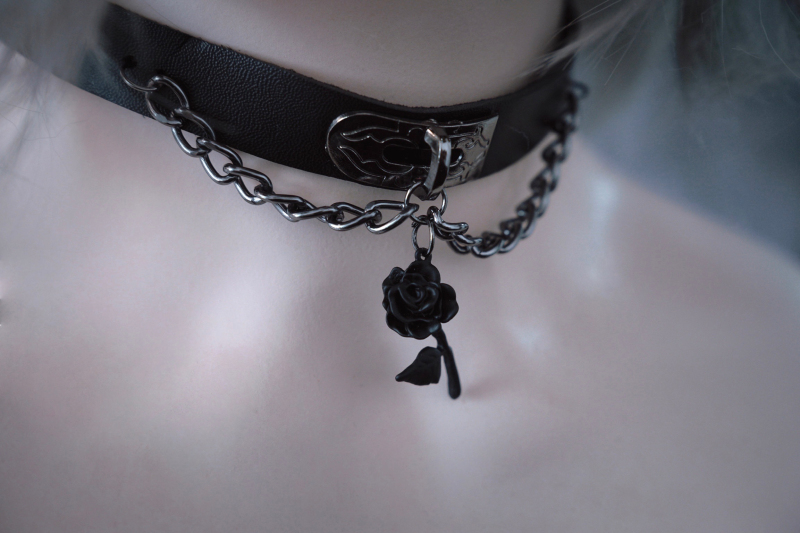 怪糖饰物集原创手工仿皮颈链choker玫瑰吊坠暗黑亚文化黑色