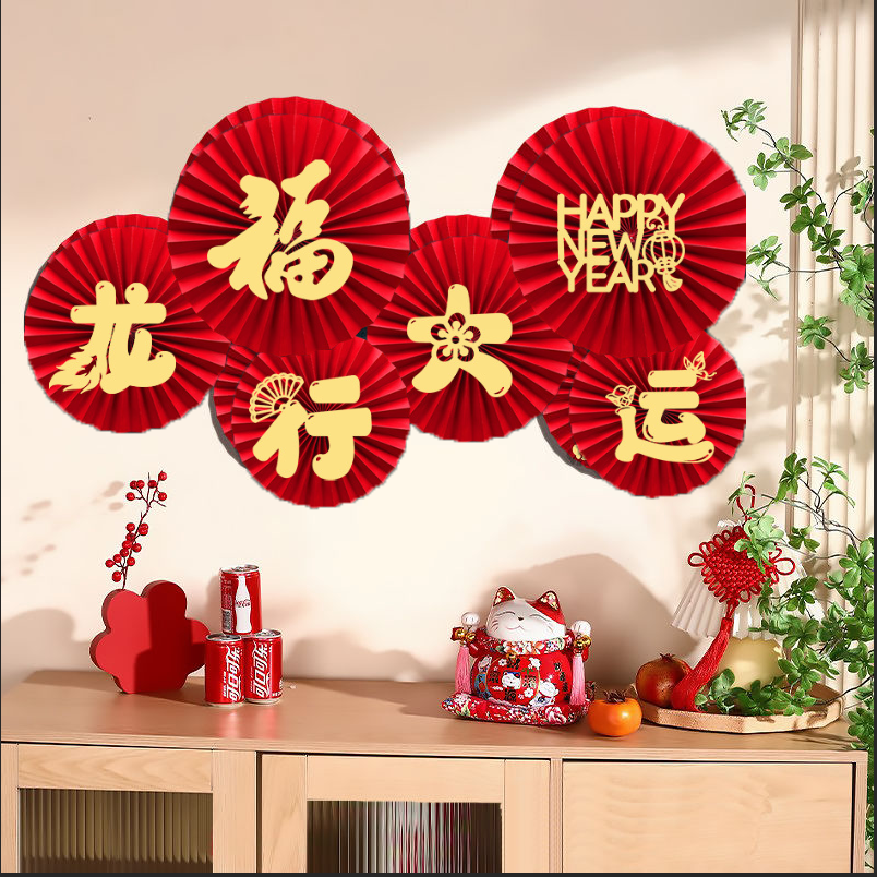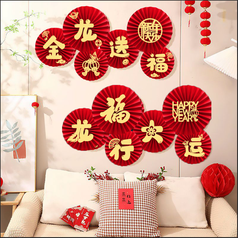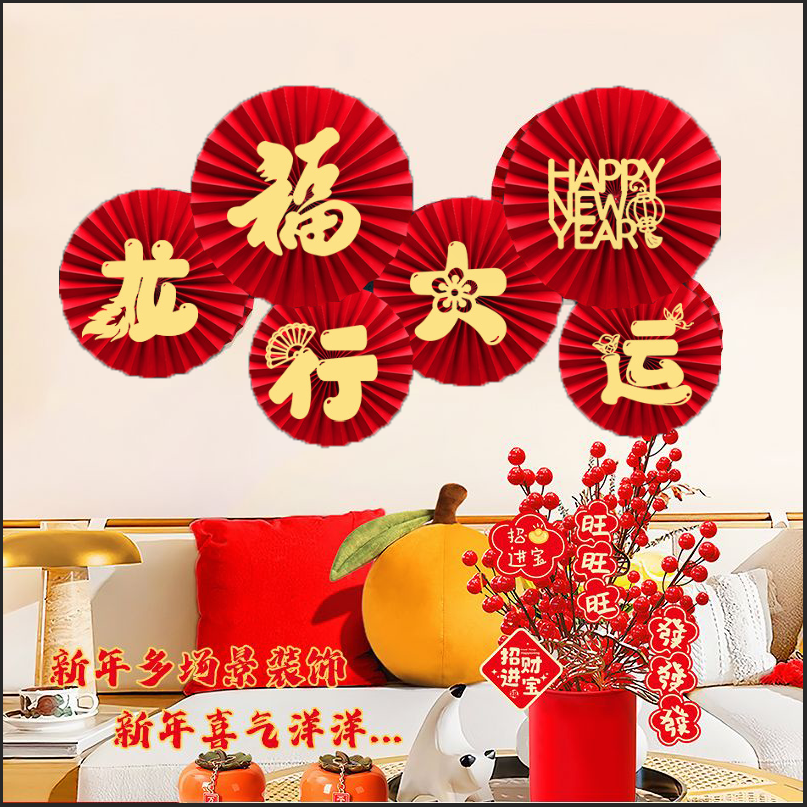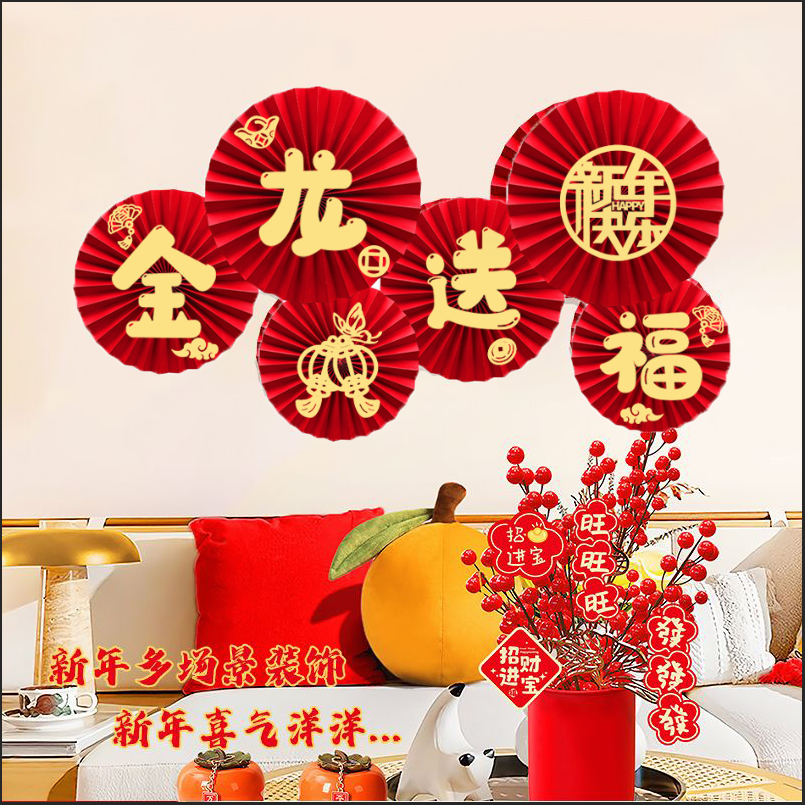 2024龙年春节纸扇花装饰商场超市背景墙客厅场景布置元旦过年挂件