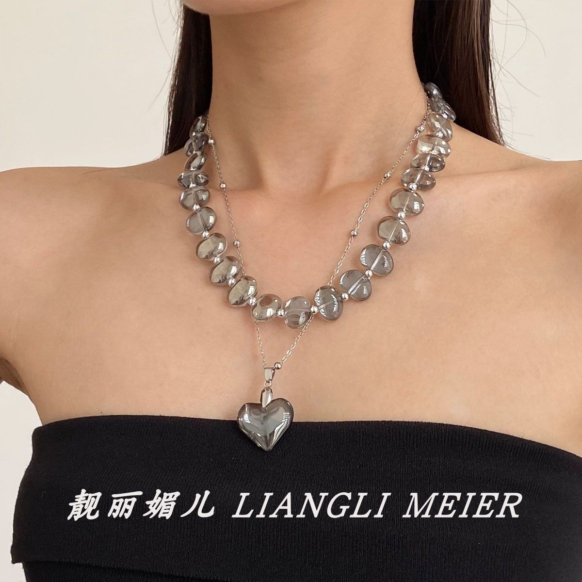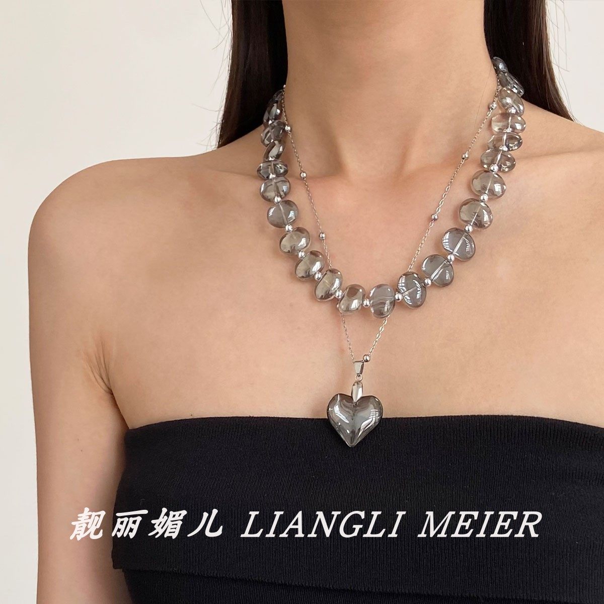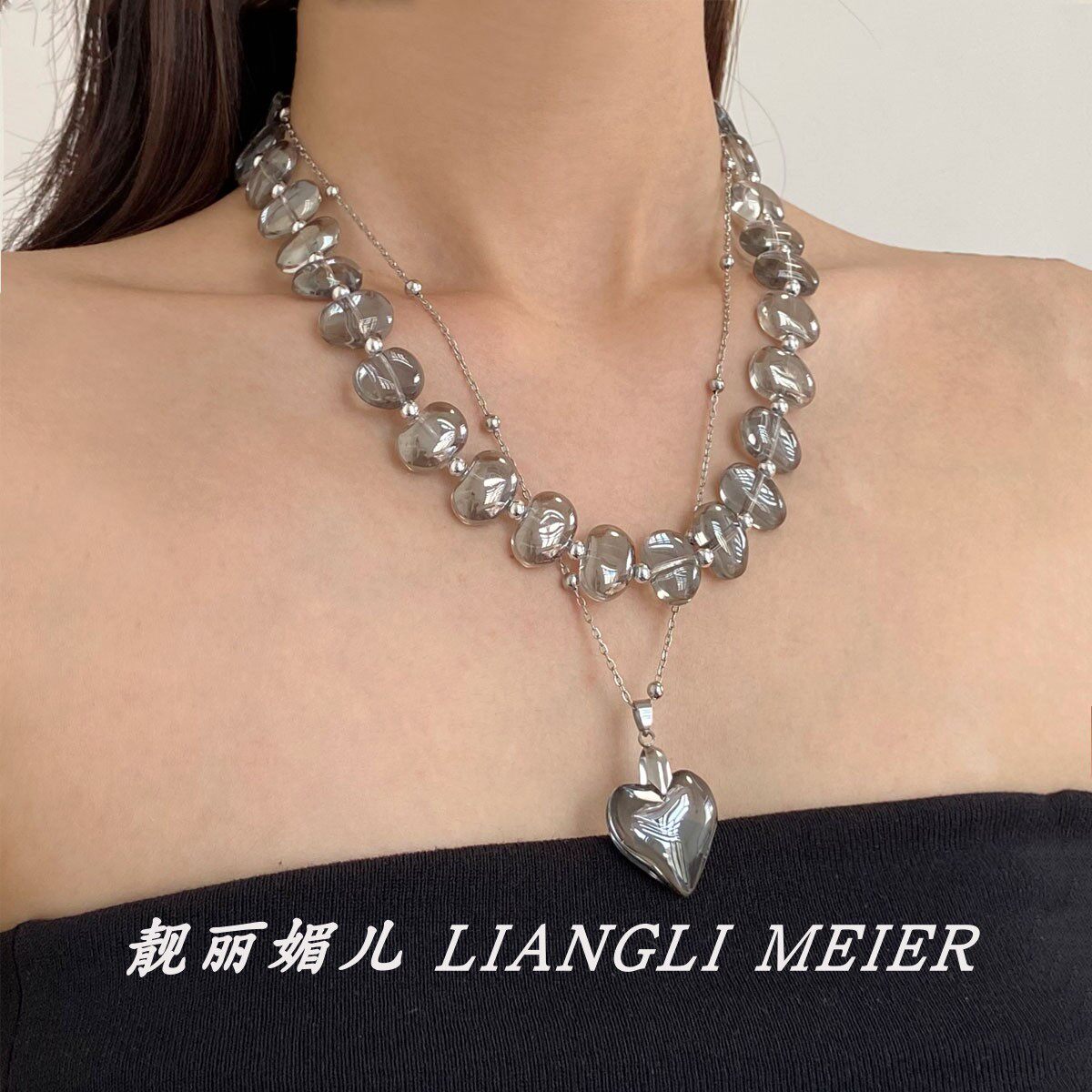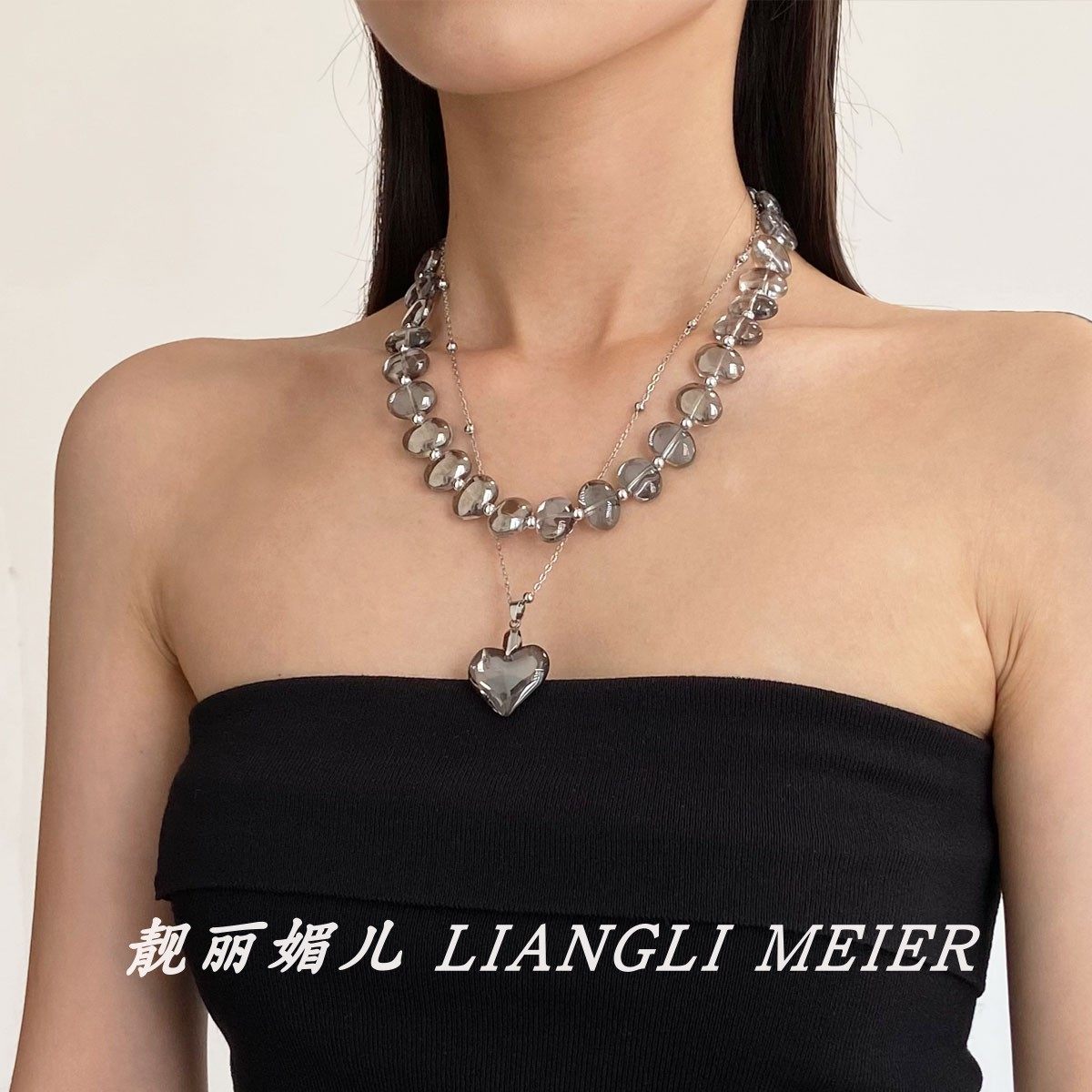灰色水晶串珠爱心项链女配饰叠戴不规则透明锁骨链choker多层颈链