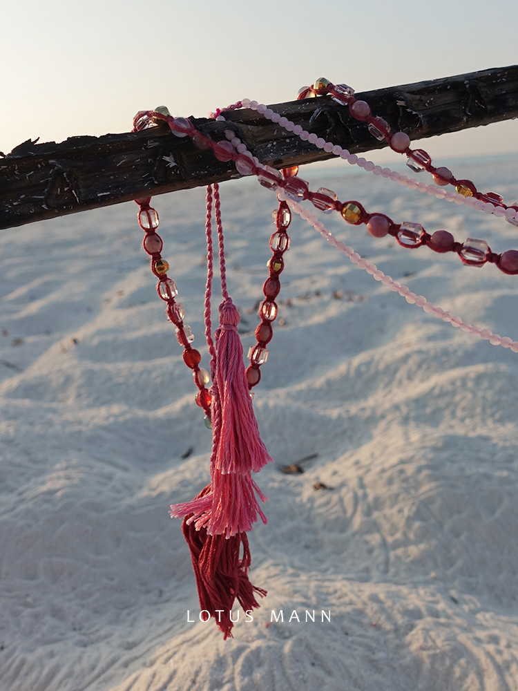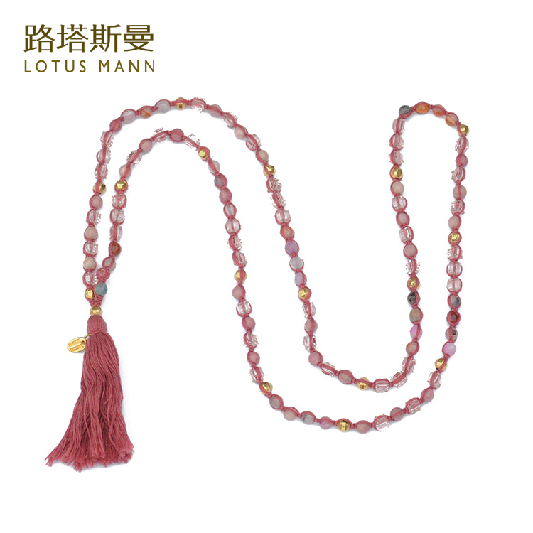 摩卡玫瑰。深粉色棉线编织红纹石与玛瑙拼色长款流苏项链