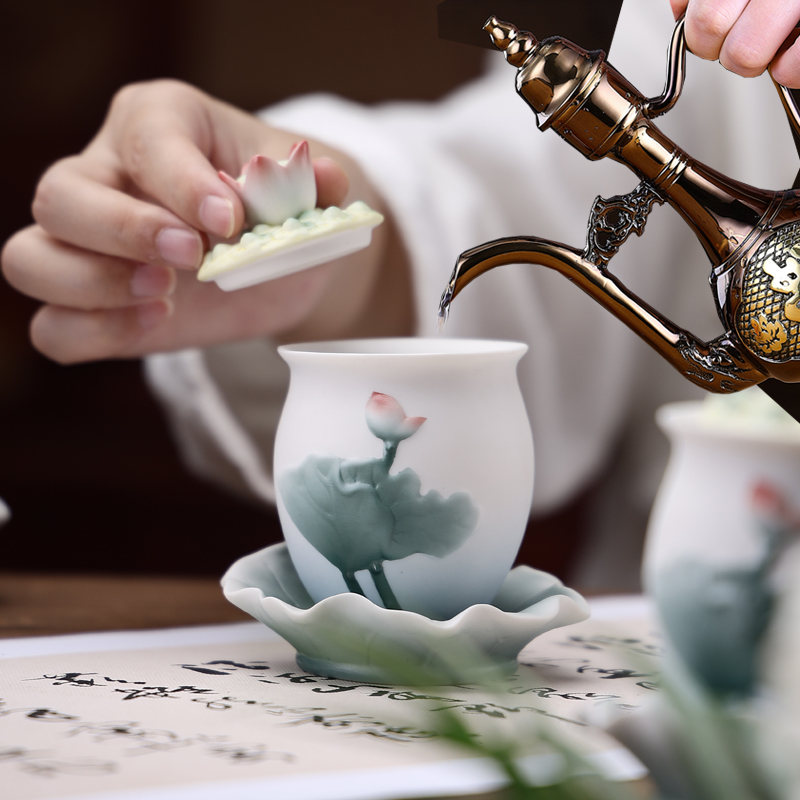 荷韵彩绘陶瓷供水杯浮雕莲花供杯佛杯圣水杯佛前大悲水摆件家用