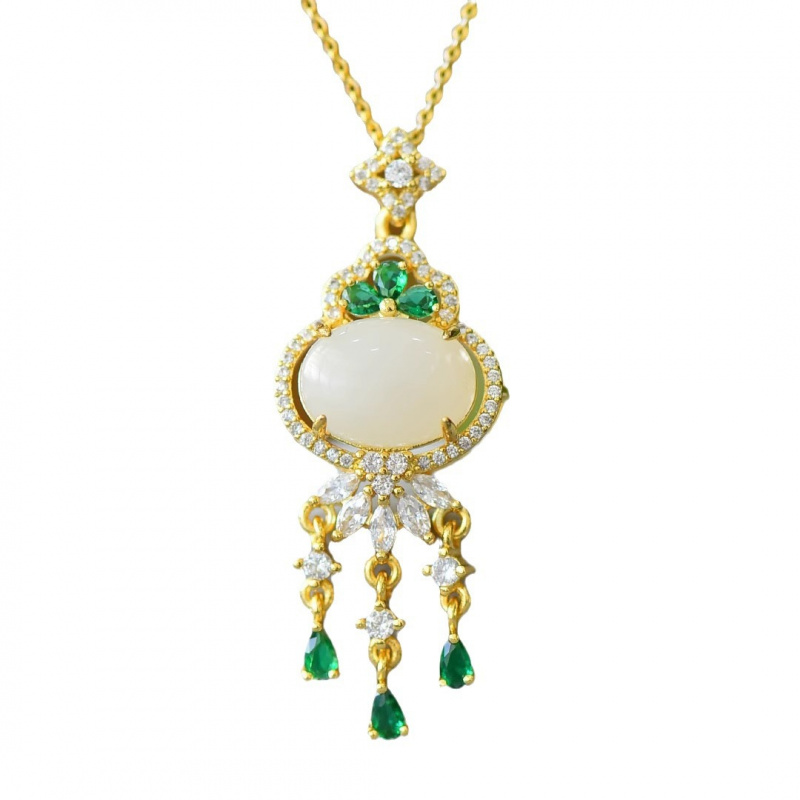 【好运】古法纯银镶嵌和田玉青白玉时尚轻奢项链女士锁骨链项链