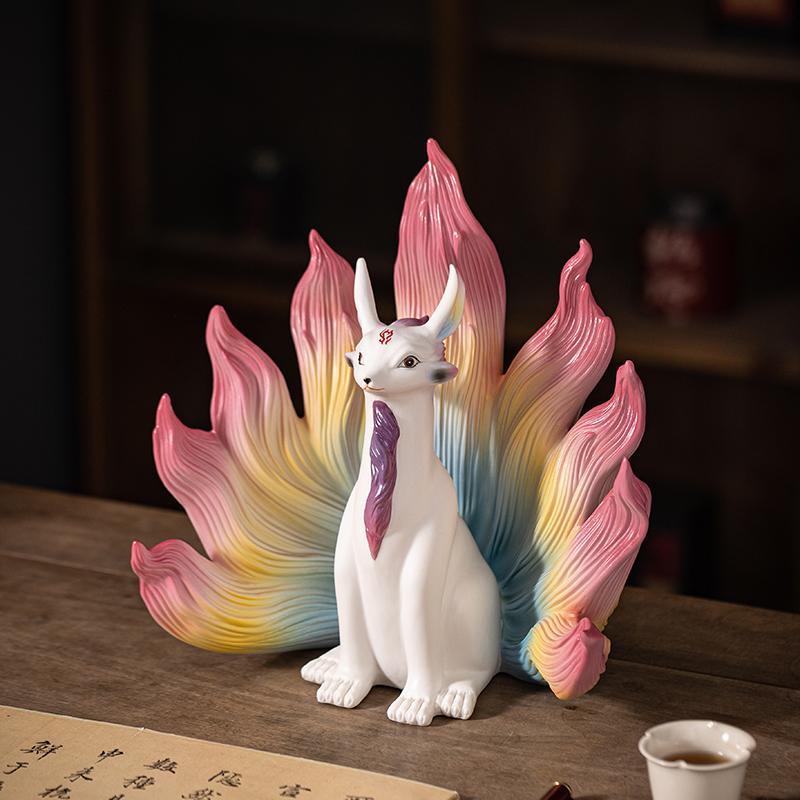 九尾狐摆件小狐狸九尾灵尾办公室客厅桌面陶瓷工艺品动物灵狐摆设