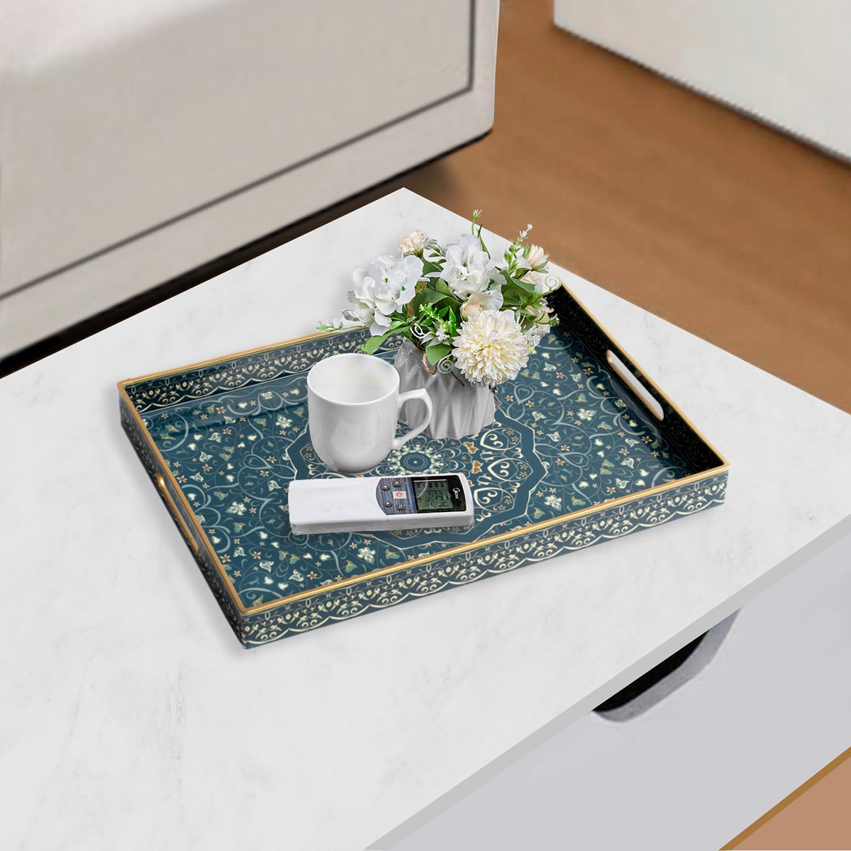 装饰托盘圆形PP塑料带把手咖啡桌收纳摆件绿色摩洛哥风花纸茶几盘