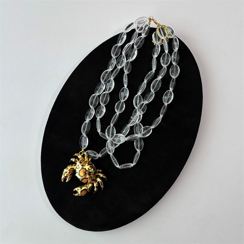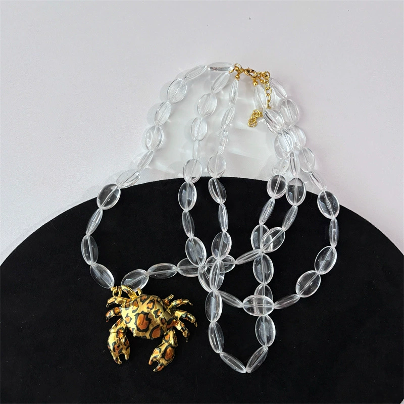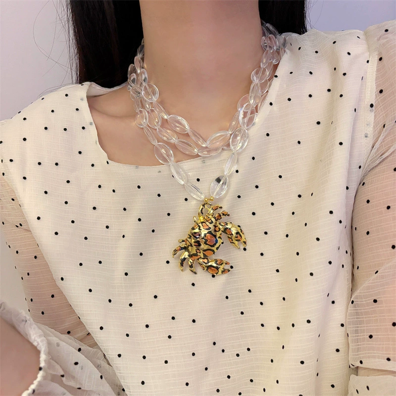 欧美夸张多层透明串珠豹纹螃蟹吊坠项链女款轻奢小众锁骨链