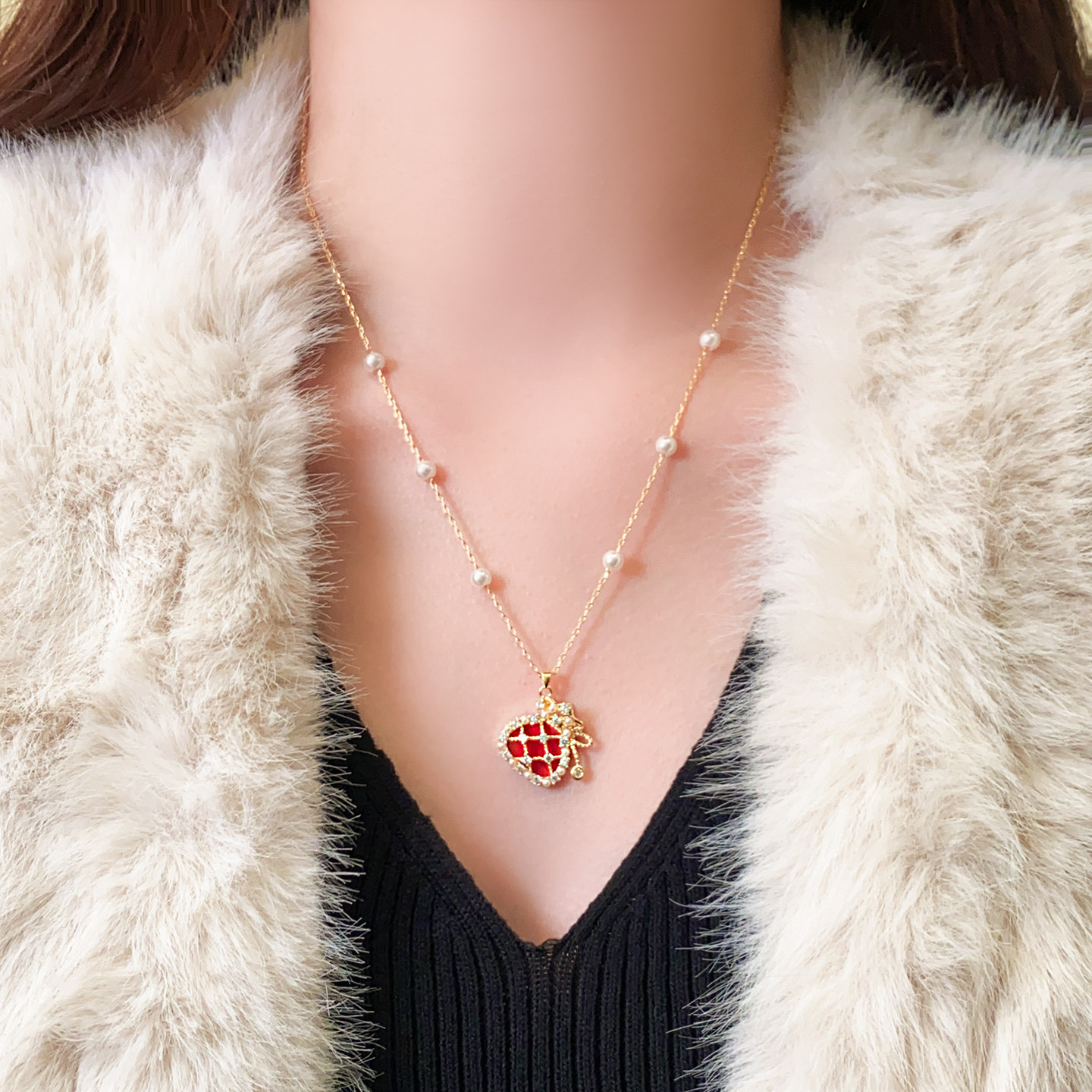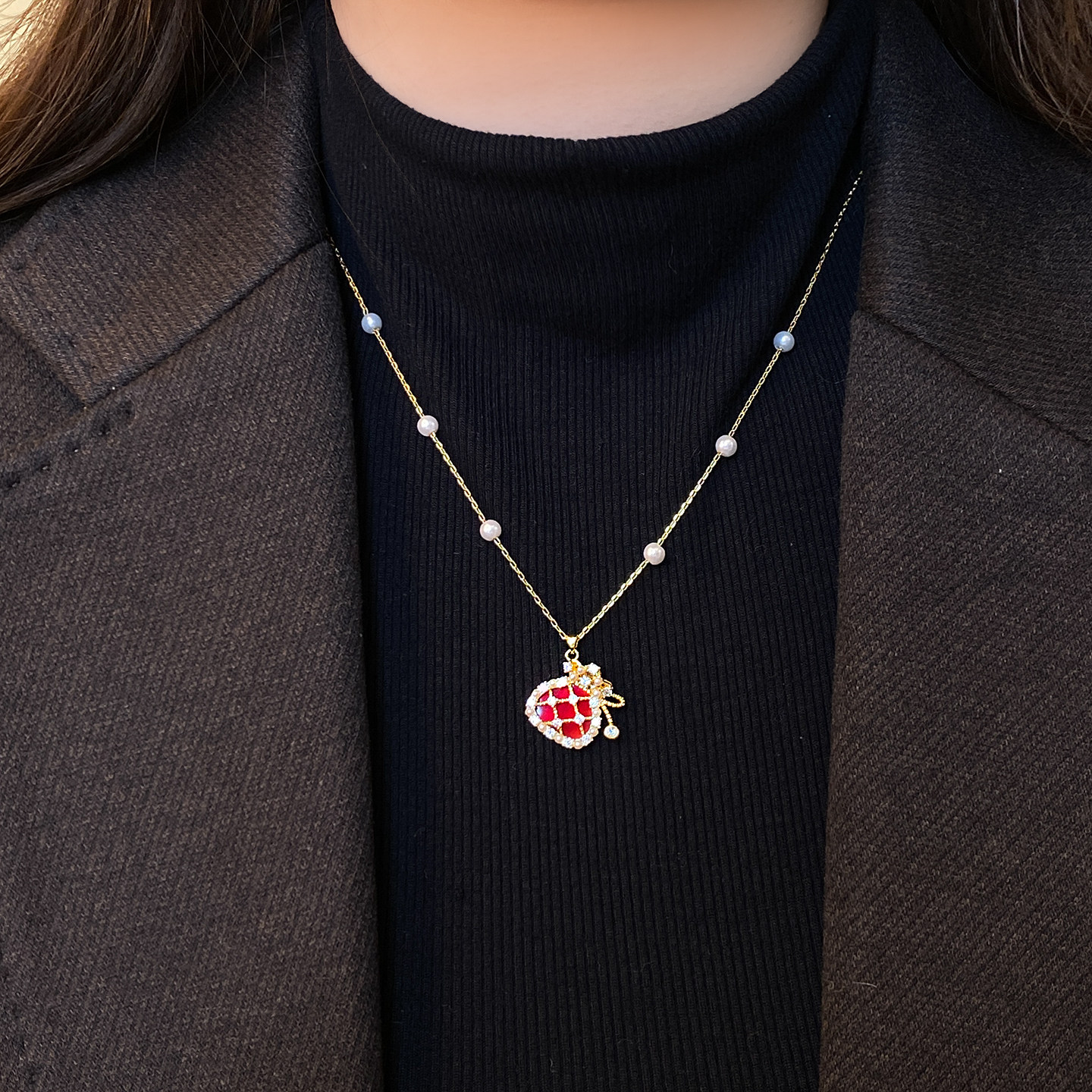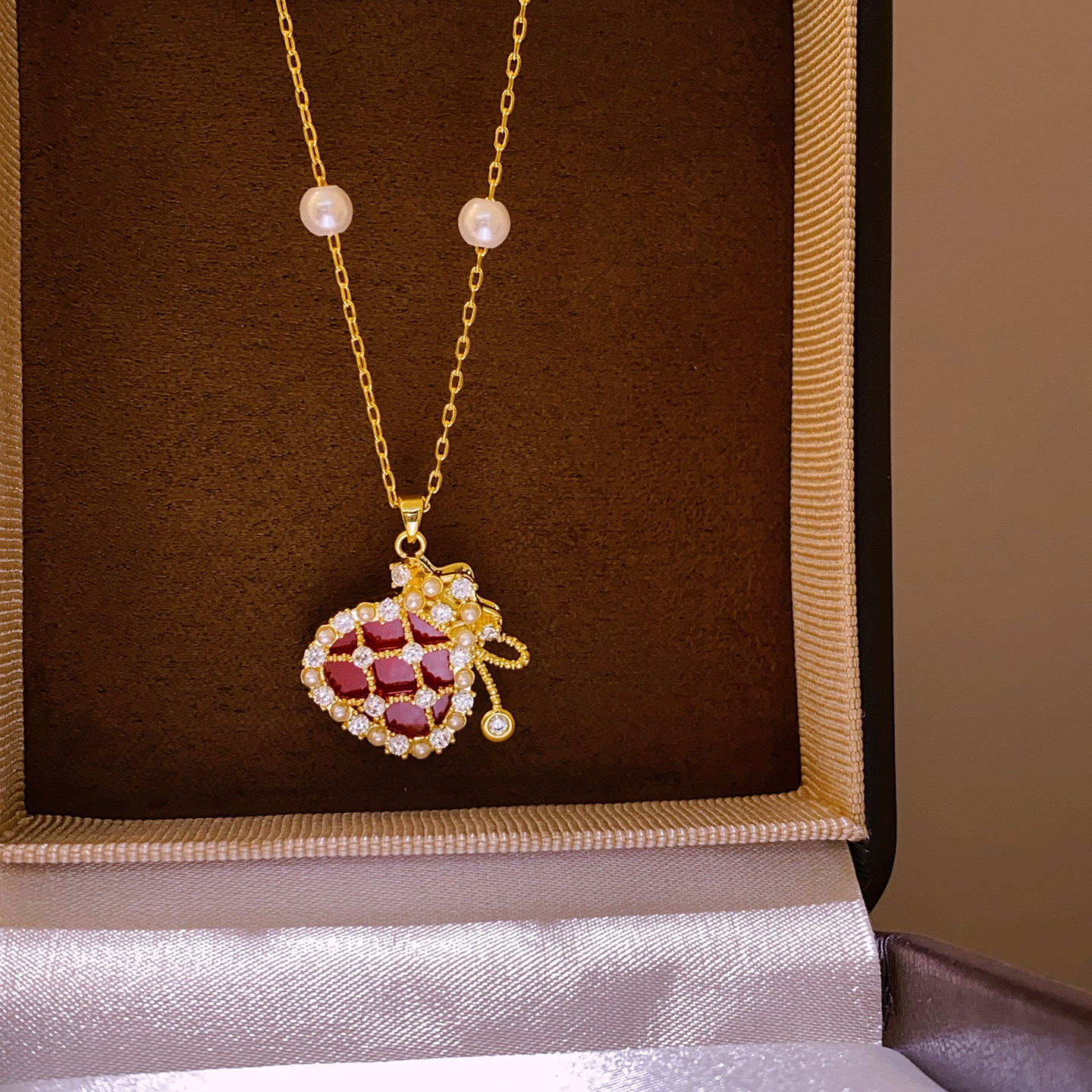 红色微镶福袋吊坠珍珠串珠项链女款秋冬毛衣链轻奢高级感2025新款