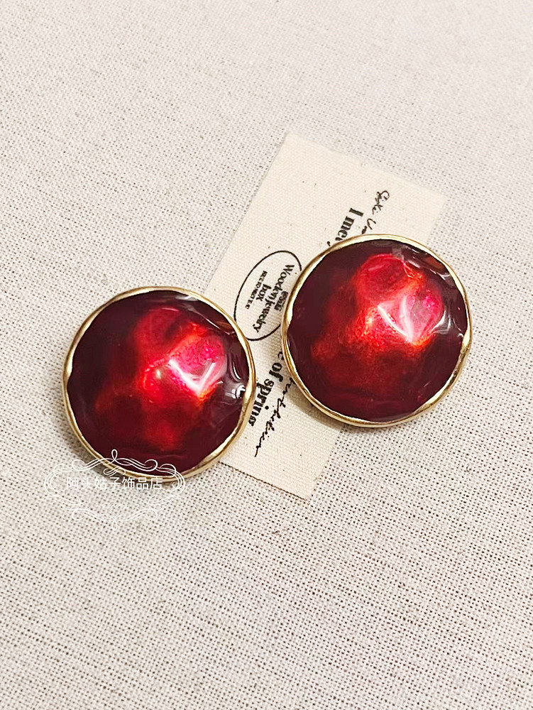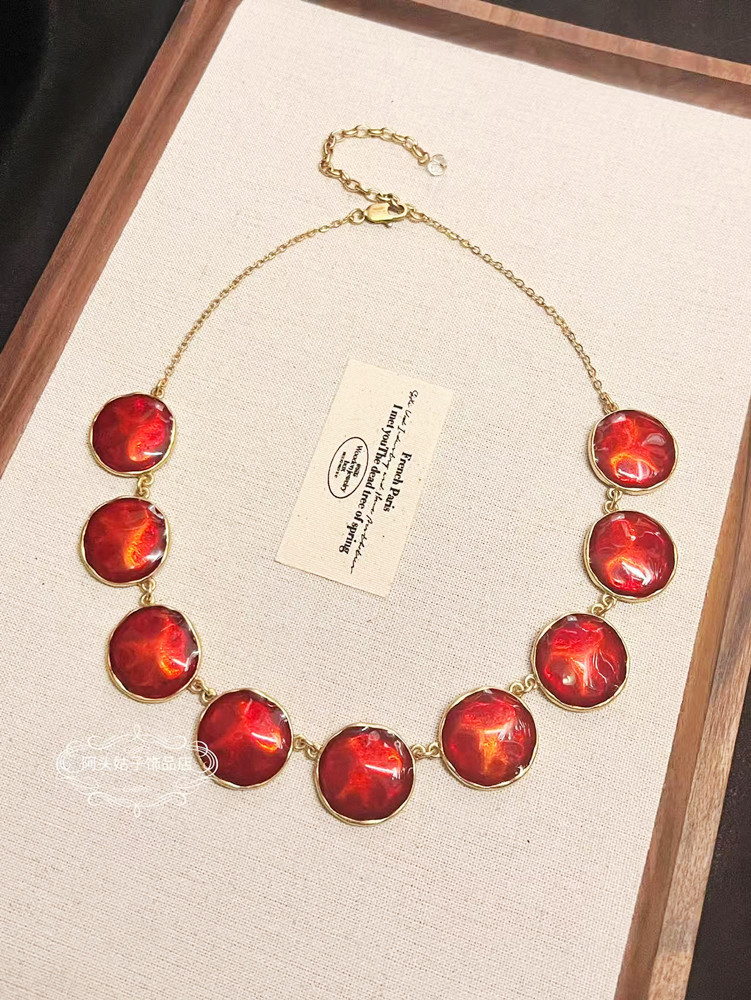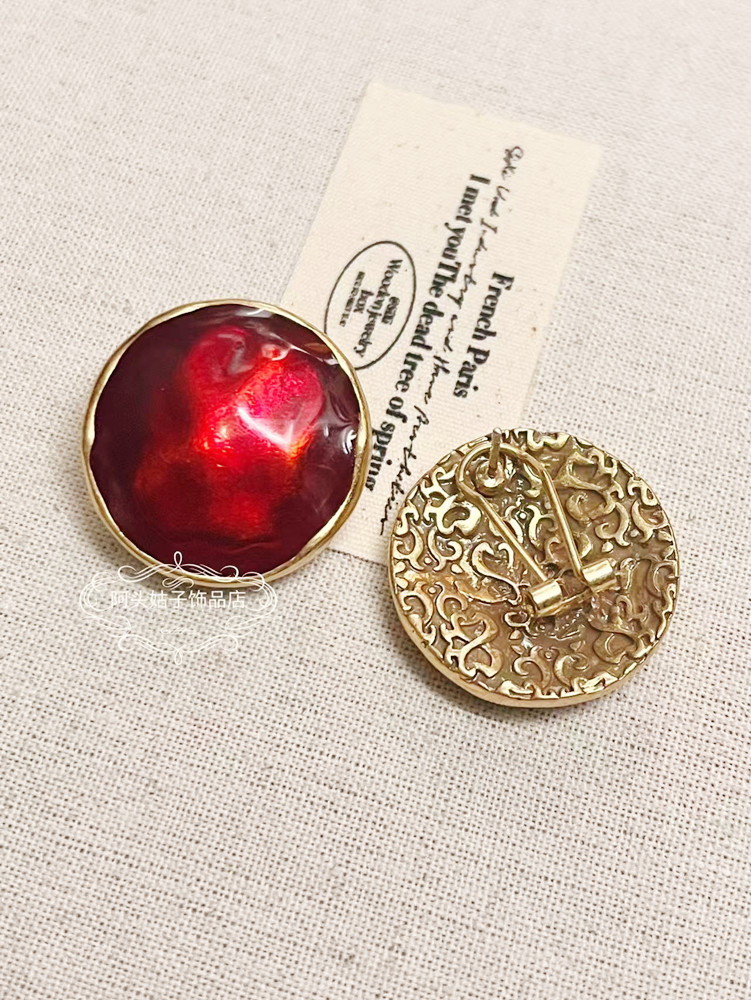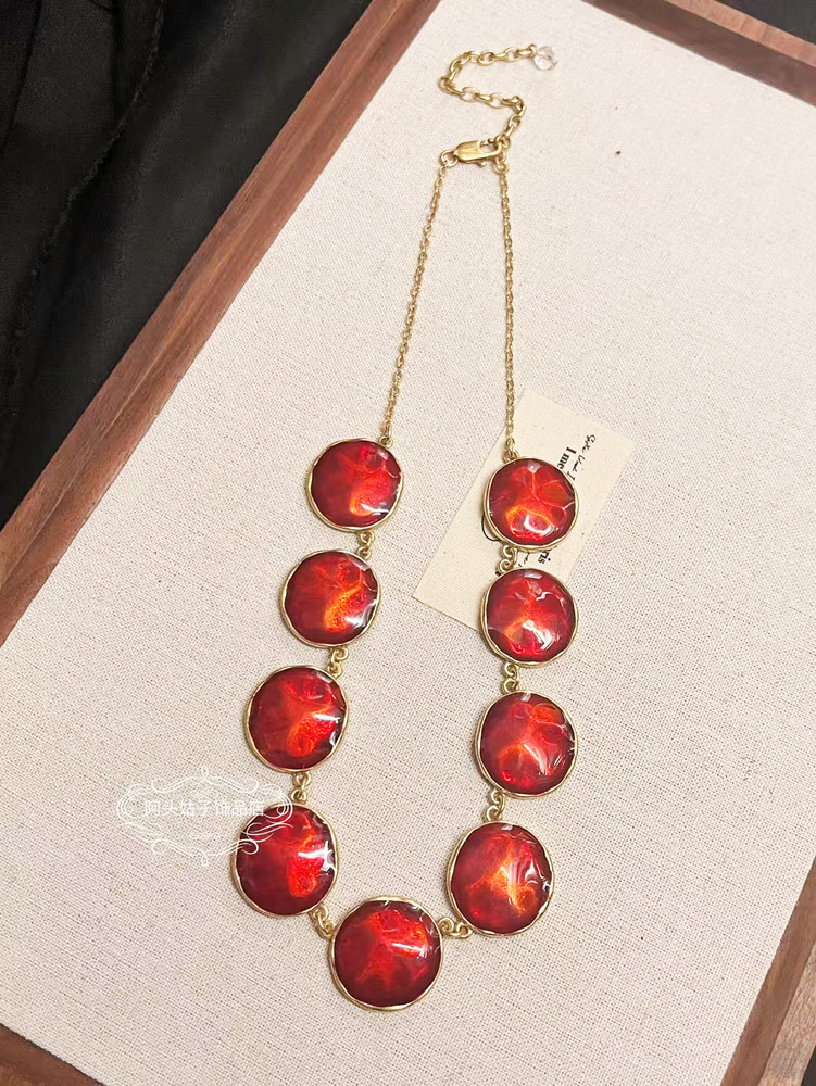 欧美中古vintage复古气质铜镀金做旧红色圆形珐琅波纹项链耳环女