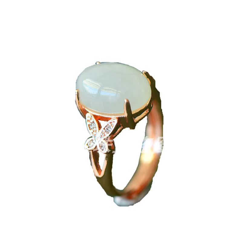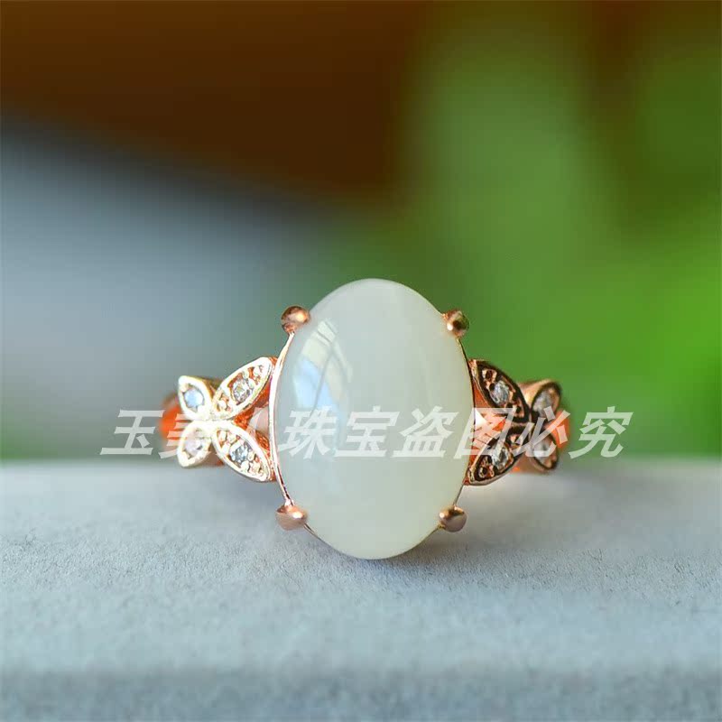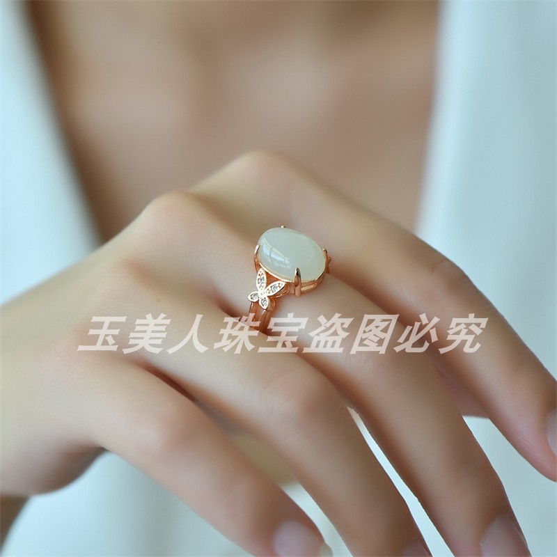 新疆天然和田玉白玉蛋面时尚精美戒指女款镶嵌玉石指环可调节戒圈