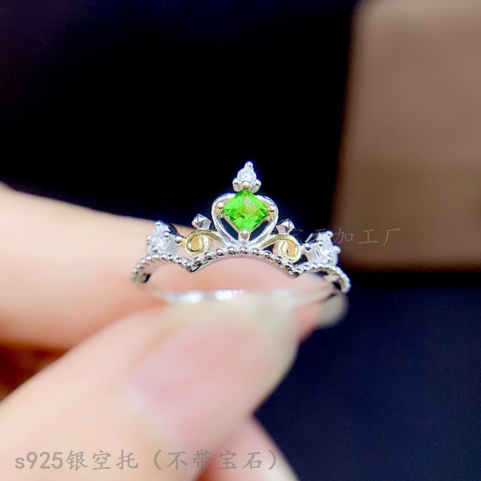 s925纯银正方形3*3 4*4mm戒指空托 天然透辉石重工镀双色女戒皇冠