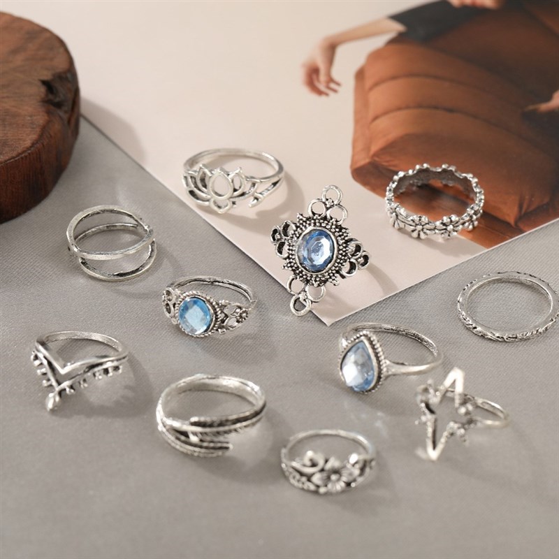 rings women 11pcs set 雕花镶钻星空宝石树叶复古关节戒指11件套
