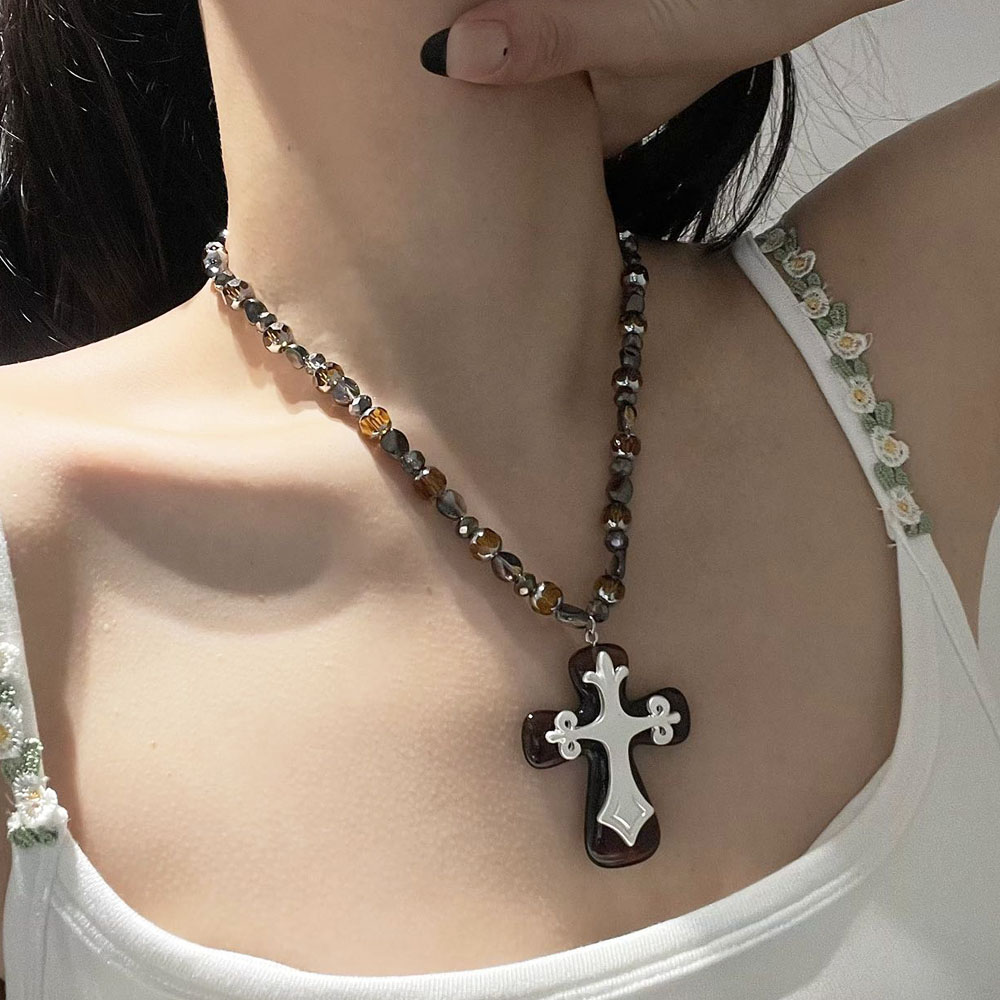 甜酷辣妹风夸张树脂白色十字架吊坠长款复古轻奢串珠项链毛衣链