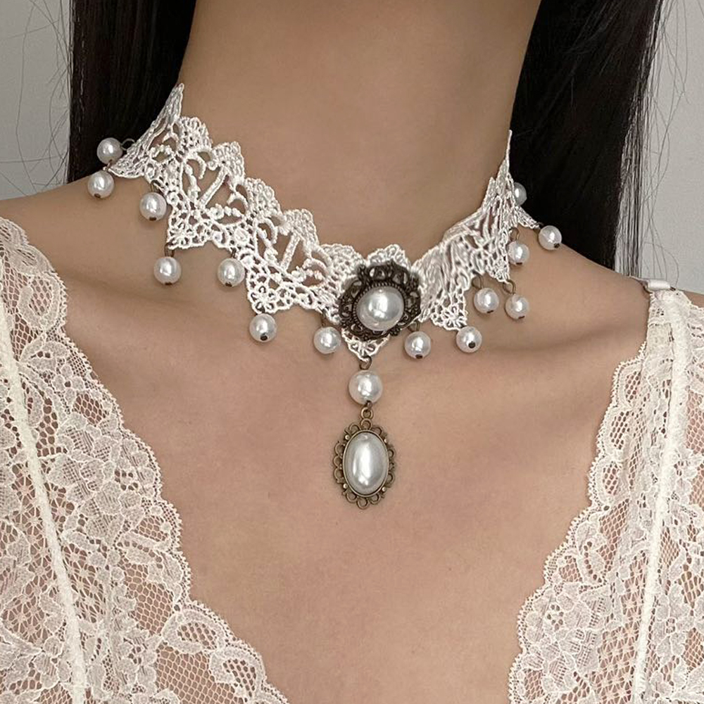 法式复古白色蕾丝珍珠流苏吊坠项链女小众设计感个性锁骨链颈链潮
