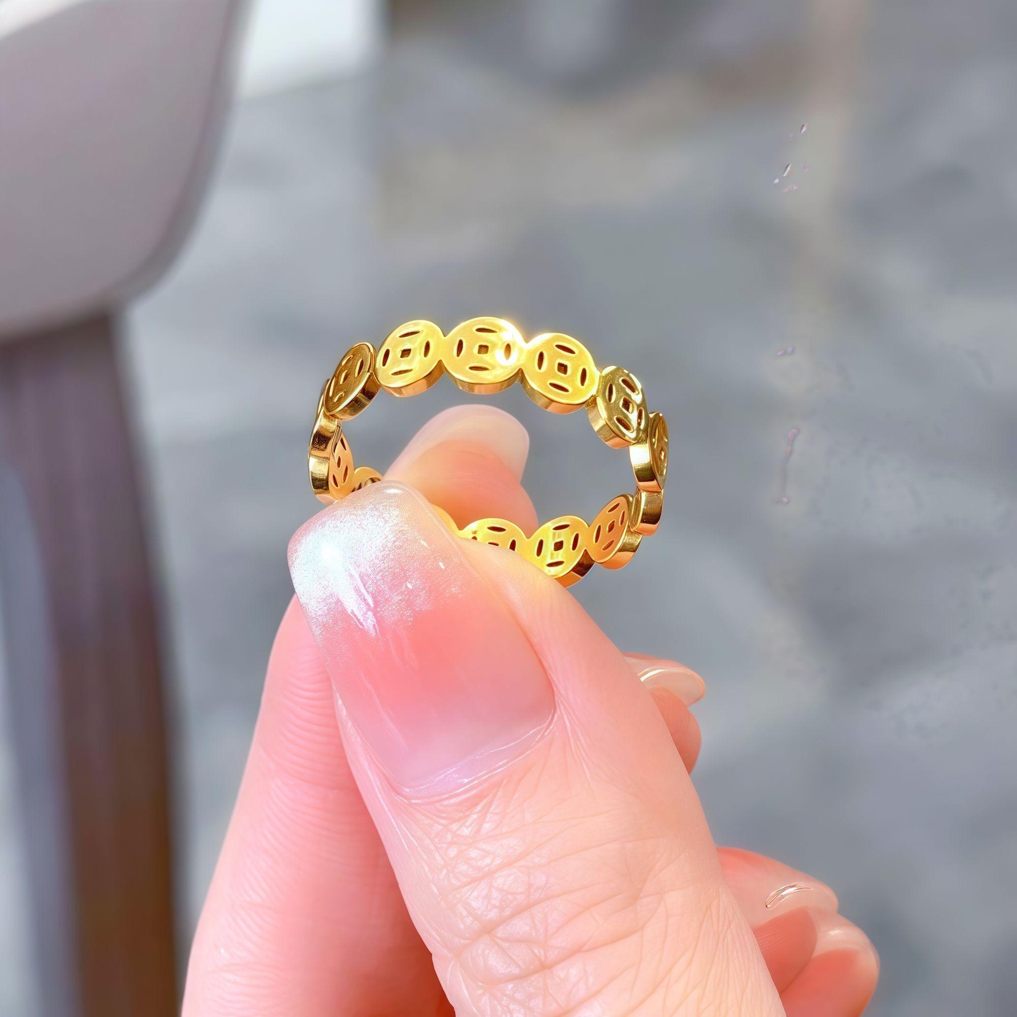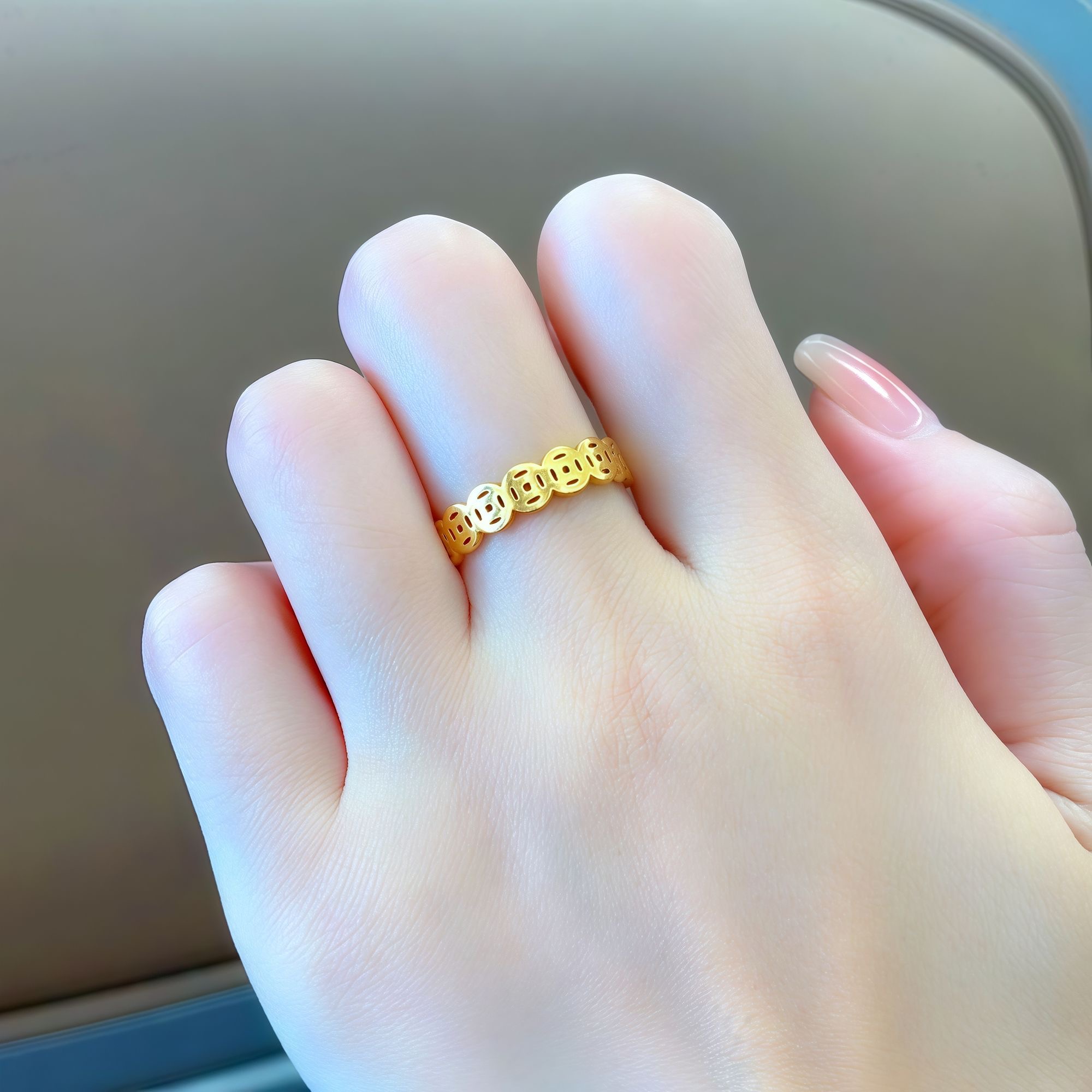 沙金铜钱戒指女招财钱多多素圈戒指男女情侣镂空戒指食指环不掉色