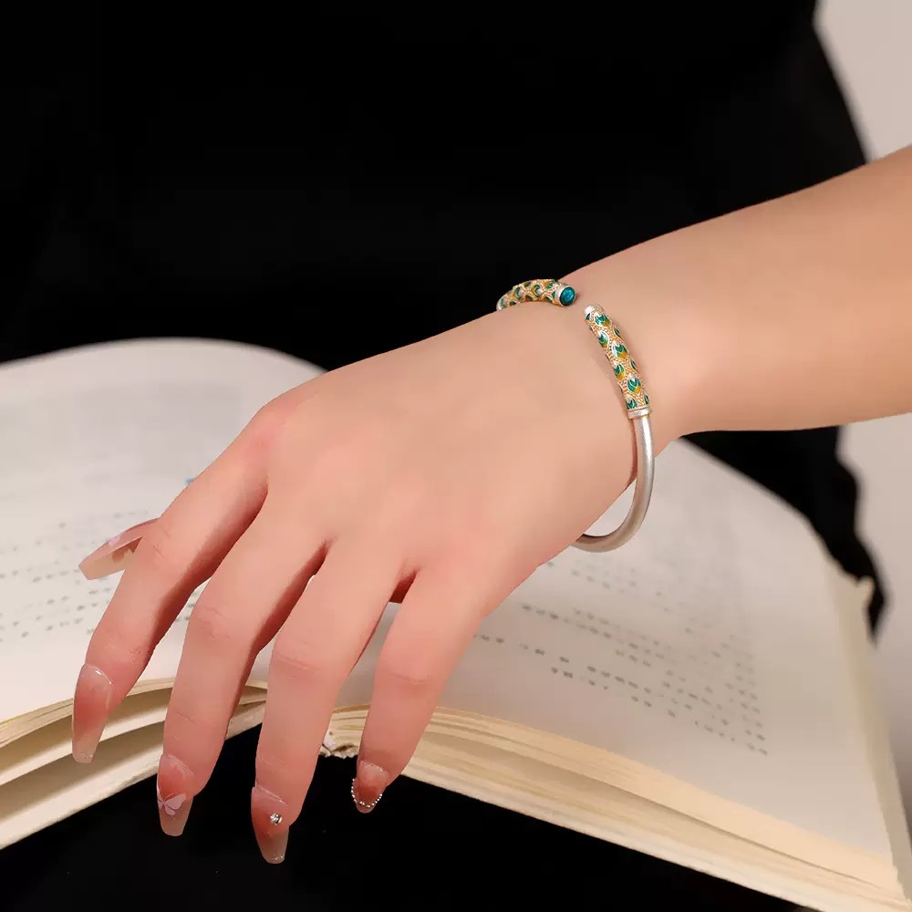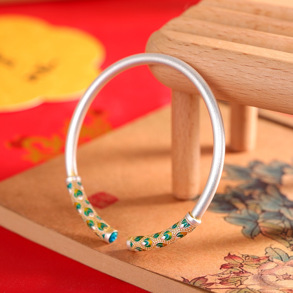 国风足银9999凤凰尾手镯女开口实心高级感纯银镯子复古珐琅彩礼物