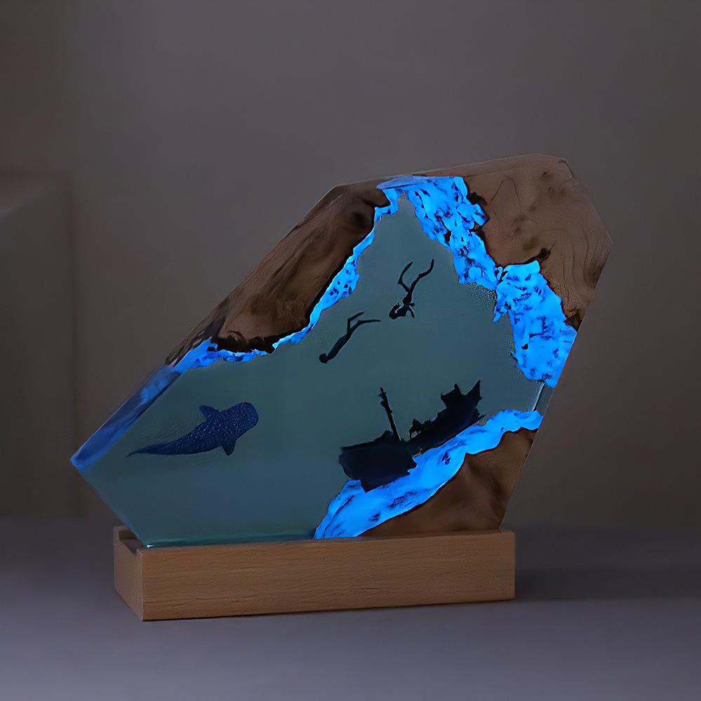 家居饰品卧室办公室桌面沉船鲨鲸海洋艺术摆件礼物实木树脂小夜灯