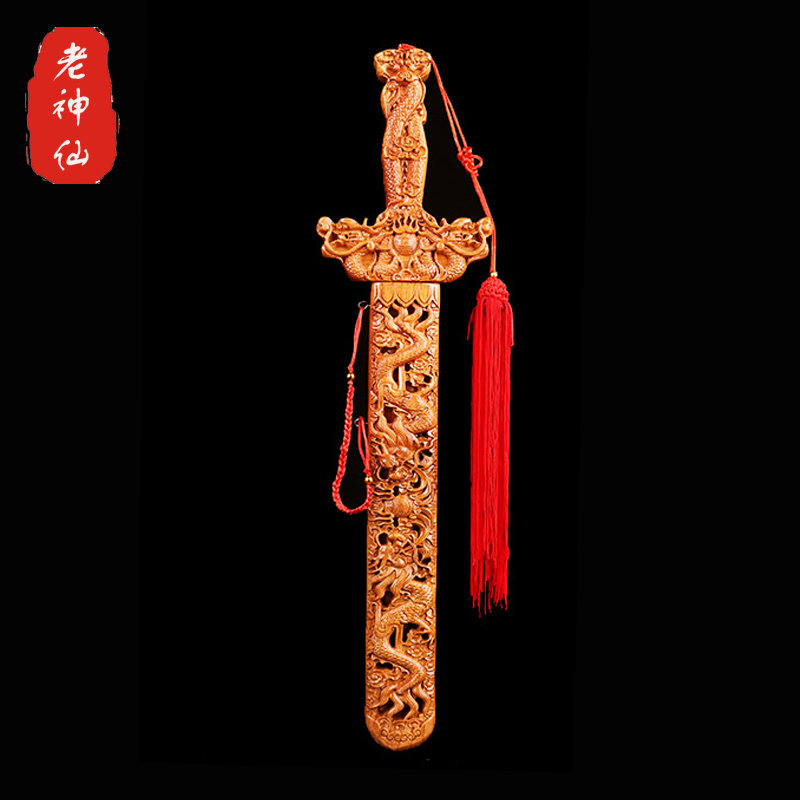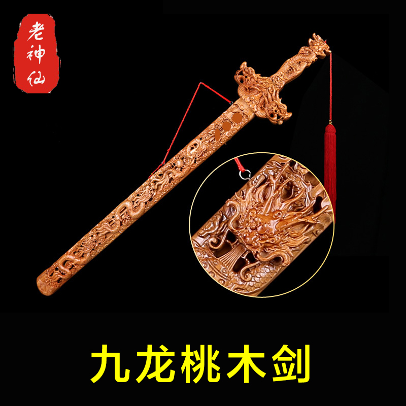 老神仙摆件九龙桃木剑 纯桃木雕镂空雕刻工艺 道家法器挂件