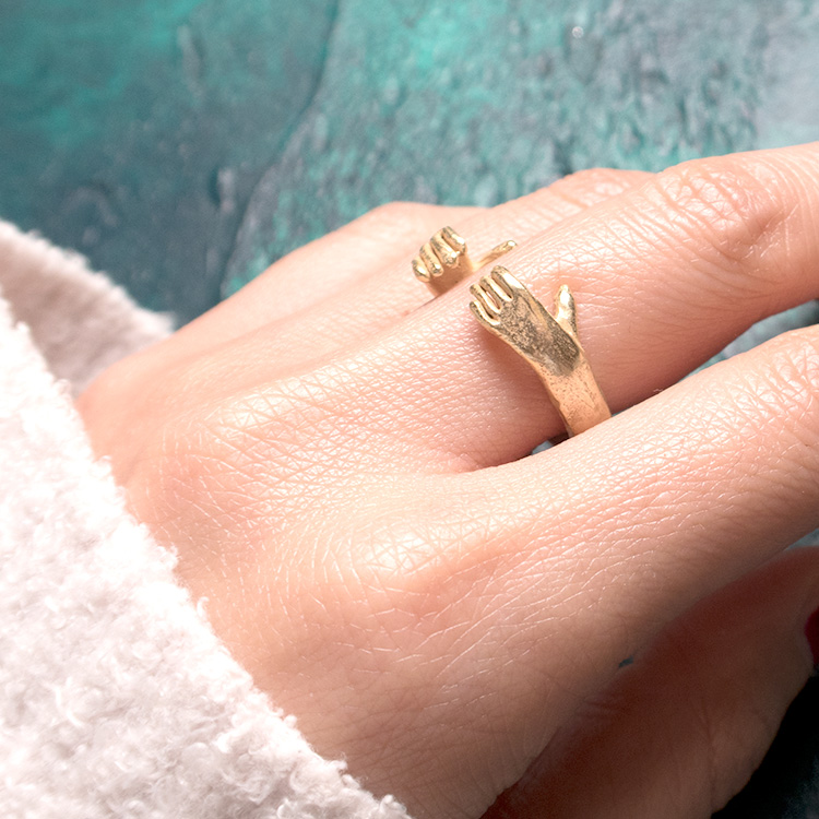 palnart poc日本金属拥抱猫咪小手 可爱个性潮女开口手工戒指
