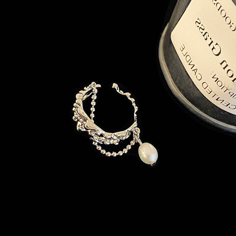 日韩S925银甜美珍珠戒指女复古时尚流苏链条开口指环嘻哈食指戒潮