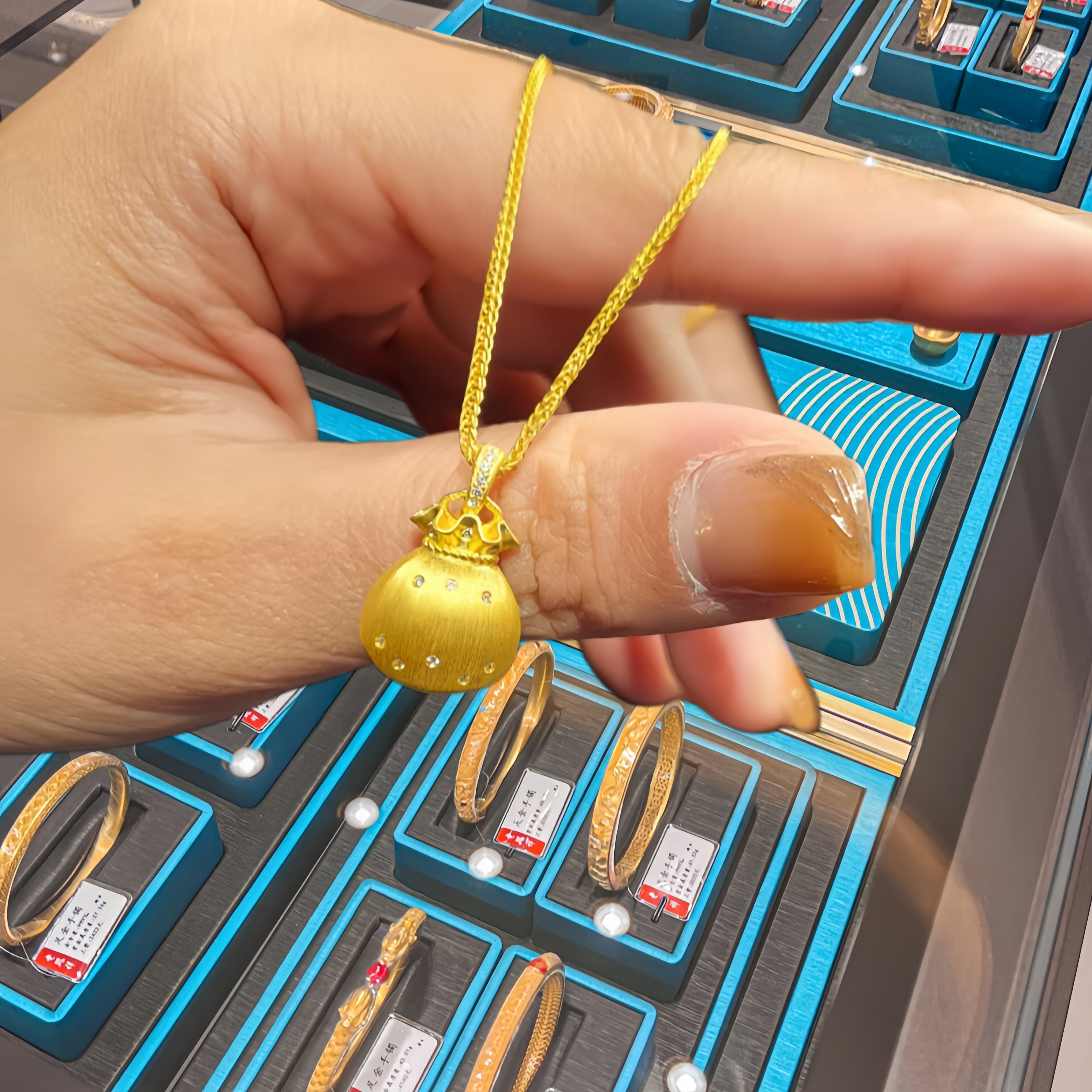 十年老铺黄金包银古法拉丝小钱袋点钻吊坠女项链小福袋挂坠锁骨链